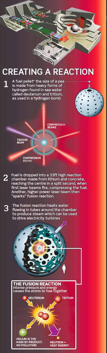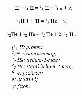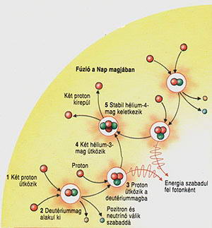 A Föld több ezer tudósa egy világméretű összefogás keretén belül 50 éve dolgozik azon, hogy ezt a veszélyt elhárítsa. Céljuk, hogy itt a Földön is munkára fogják azt az energiát, amely Napunk hatalmas energiakészletét biztosítja: vagyis az atomok magjainak egyesülésekor felszabaduló magfúziós energiát. A Napban az energiatermelést alapvetően hidrogén-hélium fúzió szolgáltatja. A hidrogén héliummá alakulása több lépésben megy végbe: 1. A hidrogén atommagok (protonok) deutérium magokká egyesülnek, neutrínó és pozitron keletkezése közben. 2. A deutérium magok protonokkal ütközve 3-as tömegszámú hélium atommagokká alakulnak, gammasugárzást bocsátva ki. 3. A 3-as tömegszámú hélium atommagok 4-es tömegszámúvá alakulnak protonok kilépése mellett. Ez a proton-proton ciklus. A Napban végbemenő másik jelentős energiatermelő folyamat a szén-nitrogén-oxigén ciklus.