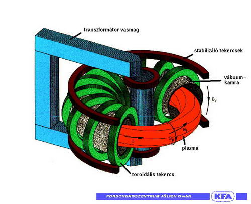 A tokamak magas hőmérsékletű plazma létrehozására szolgáló berendezés. Célja olyan körülmények elérése amelyben a plazma atommagjai között energiatermelésre használható gyakorisággal következnek be fúziós reakciók. E cél eléréséhez a plazma hőmérsékletnek 10-100 millió Kelvint kell elérnie ami kizárja hogy az bármilyen anyagi kontaktusban legyen a tárolóedény falával. Ennek megakadályozására a tokamak berendezés erős mágneses tereket alkalmaz. A tokamak alapvető részei (lásd az ábrát) a tórusz alakú vákuumkamra, a toroidális tekercs, a transzformátor és további kiegészítő tekercsek. http://www.rmki.kfki.hu/plasma/fusion_sav/tokamak.h.gif