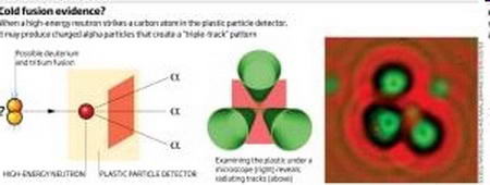 Neutronokra utaló nyomok A kutatók beszámolója szerint az anyag vizsgálata során talált nyomok hármas mintázatot mutattak, melyek azonos kiindulópontból származhatnak. A kutatócsoportban úgy gondolják, hogy a magreakciók eredményeként, a deutérium-magok fúziójakor létrejövő neutronok becsapódásával alakultak ki a nyomok, vagyis ezzel az eljárással már bizonyítható a neutronok jelenléte ezekben a reakciókban.