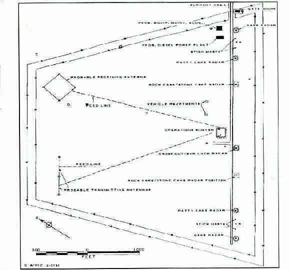 2. ábra. Vázlatrajz a szovjet Micsurinszk Radar Állomásról a Corona felderítő mesterséges hold fényképei alapján. Az igen nagy számban elhelyezett radarokat a NATO a következő kódnevekkel látta el: Gage, Rock, Cake/Stone, Cross out/Bar lock ésPatty cake. Ezen állomások helyének meghatározása és sugárzási teljesítményük meghatározása volt az amerikai vadászmenyét műholdak feladata. (Nemzeti Fotó Kiértékelő Központ)