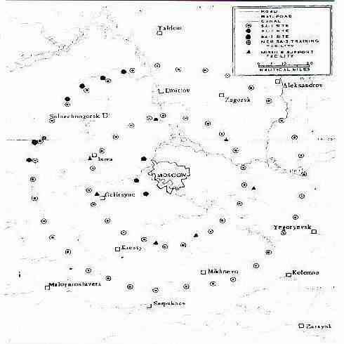 3. ábra A térképen látható a CIA által felderített föld-levegő rakéták gyűrűinek elhelyezkedése Moszkva körül. Új kilövőállások, mint például az SA-3, sikeres detektálása történt meg fotografikus úton, valamint kisugárzásuk alapján, az amerikai Grab/Dyno, a Program 102, és a Program 989 műholdjai segítségével. A radarok elhelyezkedése és üzemelési paramétereinek ismerete fontos volt az amerikai bombázó repülőgépek Moszkva elleni bevetésének tervezésénél. (Nemzeti Fotó Kiértékelő Központ)
