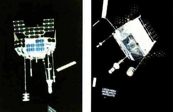 4. ábra. A Lockheed P-11 kutató mesterséges holdjának két képe. A Program 989 vadászmenyét szub-műholdak valószínűleg ezen a konstrukciós bázison alapultak, beleértve a többszörös antennarendszert. Ezt a mesterséges holdat eredetileg a Samos-4 névvel látták el. (Fotó: Dwayne A. Day)