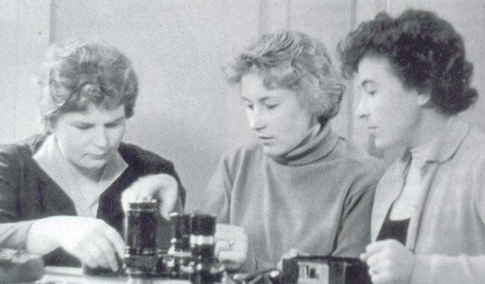 4. ábra. Az első három női kiválasztott, Tyereskova, Tatjana Kuznyecova és Szolovjeva, láthatóan fotóberendezéseket tanulmányoznak; 1962-ben, kiképzésük kezdetén.