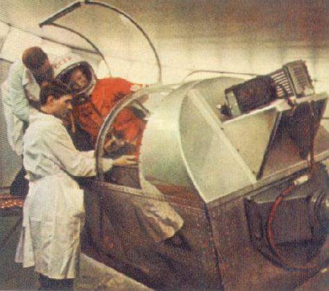 8. ábra. Valentyina Ponomarjeva, a női űrhajóscsoport legidősebb tagja, a legmagasabban képzett közöttük az akadémikus tudományok terén, és egyben az egyetlen pilóta – a Vosztok kiképzőkapszula belsejében.