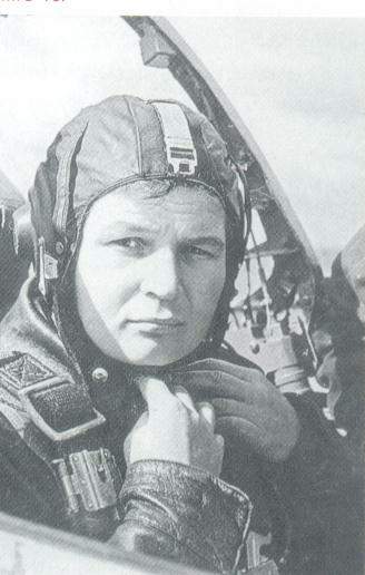 7. ábra. Tyereskova fejére illeszti sisakját, közvetlenül egy Míg-15-ös gépen (a hátsó ülésen) elvégzendő tesztrepülése előtt.