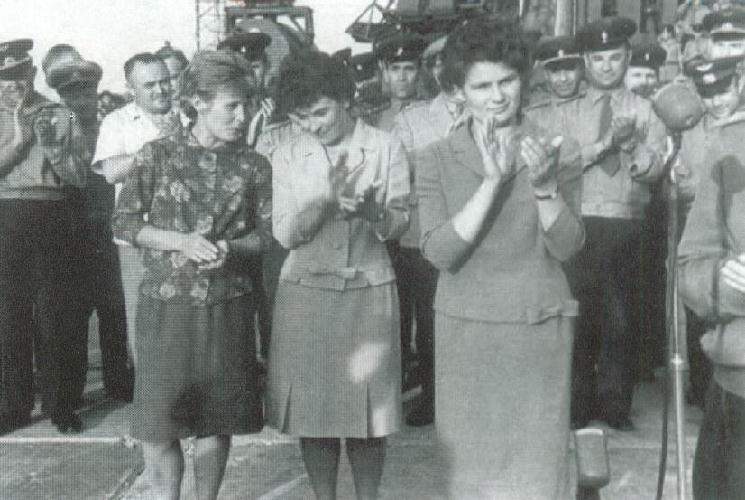 1963. június 15. a kilövés eseménye. A rakéta aljánál Tyereskova az űrrepülésre való felkérés elfogadásáról tartja beszédét, miközben Ponomarjeva és Szolovjeva látszólag osztozik az emelkedett légkörben. Szergej Koroljov a háttérben látható fehér ingben.