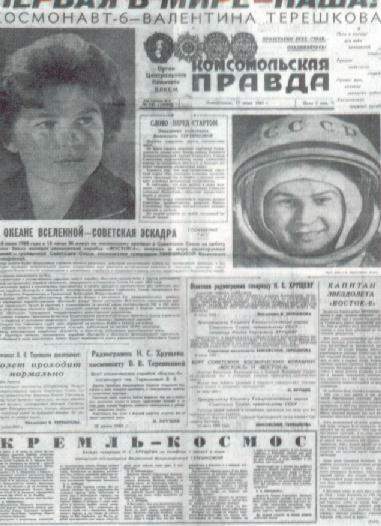 Így számolt be a Pravda Valentyina Tyereskova repüléséről június 17-én. A lap jobb oldalán látható képrészlett eredetijét széleskörűen publikálták, leleplezvén azt, hogy jelentős hamisítással állunk szemben, ami teljesen megszokott fotográfiai gyakorlat volt az akkori szovjet érában.