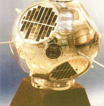 1. ábra. A GRAB műhold. Jól láthatók a napelemei a bal felső és a jobb alsó részén. A négy kicsiny kidülledés, felül kettő és alul kettő, termisztorok. Ezek közvetítettek adatokat a szerkezet felületének hőmérsékletéről, de egyben antennaként is szolgáltak a jelfelderítést végző hírszerző berendezés számára.