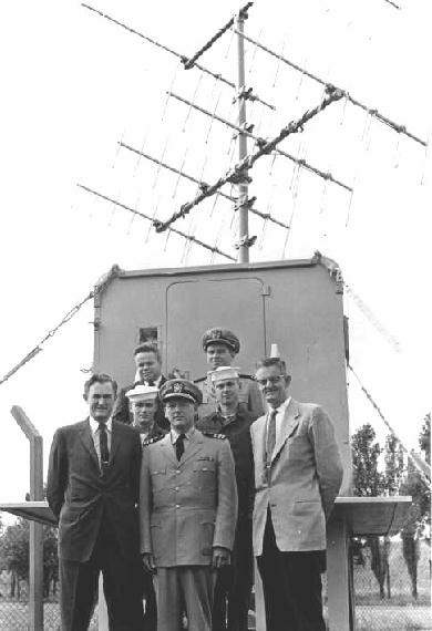 8. ábra. A GRAB megalkotásában döntő szerepet játszók csoportja az egyik földi vevőállomás előtt. Alsó sor, balról jobbra: Howard Lorenzen – az Ellenintézkedések Csoport vezetője; Irving E. Willis parancsnok – telepvezető tiszt; William Edgar Withrow – a vevőállomás rádiós mérnöke. Középen, balról jobbra: PO2 Lee – hírszerző operátor; PO1 Hilbert R. Hubble – hírszerző operátor. Felső sor, balról jobbra: Reid D. Mayo – GRAB program-irányító; John K. Wulfhorst hadnagy – telepvezető operációs tiszt.