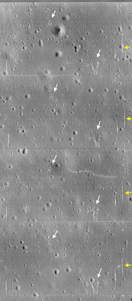 A fenti három felvételt az eredetihez képest 50%-kal kinagyítottuk. A bal oldali felvétel aránylag tiszta elrendezést mutat a fehér, vonalas alakzat vonatkozásában. Alaposan vegyük szemügyre, hogy a másik két felvételen ugyancsak látható alakzatot milyen más jellegű felszíni alakzatok övezik. Ha kamerahibáról lenen szó, és valós felszínt látnánk, akkor a vonalaknak át kellene haladniuk a felszíni alakzatokon, megszakítás nélkül. Például, a fotó teljes hosszában „+” jeleket figyelhetünk meg, azaz célkereszteket, ezeket viszik fel legutoljára a filmre, mintegy viszonyítási alapként szolgálnak és a felszín maga soha semmiféle hatást nem gyakorol rájuk. Az egyszerű tény, miszerint ezekre az ismétlődő objektumokra a felszíni alakzatok hatást gyakorolnak, ennek következtében deformálódnak, megszakadnak, egyértelműen bizonyítja, hogy ezek az alakzatok vagy a valóban a felszín részei, vagy pedig utólag kerültek rá a képre a hamis felszínt kialakító eljárás során, a képelemek lefedése alkalmával. Más szavakkal, az alakzatok a helyszín egy korábbi állapotát mutatják (akár hamis, akár valódi) és a „felszín” jelenti azt az állapotot, amit a képhamisítás során vittek fel, legutoljára, vagy ezzel együtt pedig a szálkeresztek „+” jeleit, alátámasztani igyekezvén, hogy valós dolgot látunk, nem pedig hamisítványt. A végkövetkeztetés, a teljes felszín, valamennyi alakzatával együtt hamisítvány, mesterségesen létrehozott látvány, egyetlen célja van, elrejteni valamit, ami ezen alkalmazások alatt található. Amit ugyancsak nem szabad szó nélkül hagyni itt, az a képhamisítási technika, az ebben való gondolkodás és az 1970-s évekre visszanyúló stratégia. Ami a technológiát illeti: soha ne feledkezzünk el arról, hogy ha egy bizonyos időben egy bizonyos újítás nem érhető el a nagyközönség/kereskedelmi forgalom számára, az messze nem jelenti azt, hogy ne is létezhetne a titkos/katonai/fekete szektorokban sem. Gondoljuk csak meg, ha nincs az a hiba és nem marad fent a felvételen a nyilakkal jelzett, jól körülhatárolható, mindösszesen piciny változásokat mutató alakzatok sora az egymást követő képelemeken, felkeltve a figyelmét a nem felületes megfigyelőnek - vajon miként lehetett, hogy a hamis réteg felvitelekor kikerült a szórásból? – akkor a mesterségesen kialakított táj rendkívül hatékonyan, a kétség legkisebb felmerülése nélkül – vert volna át valamennyiünket. Ennél a pontnál feltétlenül meg kell állnunk. Lényegében arról van szó, hogy a szóban forgó felvétel és az általa hordozott képi információ teljes egészében hamis, az eredeti holdfelvételt lefedték, mintha vastag festékrétegek hordtak volna fel rá, elfedvén előlünk a valóságot. Természetesen az elmondottak innentől kezdve érvényesek valamennyi holdfelvételre és azok megbízhatóságára. Honnan is tudhatnánk, hogy mi a valóság és mi nem az? Például, menjünk vissza a nagy kép harmadik elemére és figyeljük meg a tetején látható tökéletesen párhuzamos vonalat, amint keresztezi annak teljes jobb felső részét. Most mit gondoljunk róla? Valóság? Talán valóság, talán nem. Ezek után el lehet biztonsággal dönteni, mi a valóság? A történet kulcsa nem ott van, hogy a képhamisítás elrejti előlünk a valós információt, hanem arra is alkalmas, hogy érdekes, ám hamis látványt hozzanak létre általa. Miért jó ez? A bolygókutatásban olykor hasznos lehet, ha bedobnak bizonyos érdekes, ám hamis elemeket, miközben mélyen hallgatnak a drámai valóságról, amiről valaki úgy gondolja, nem tartozik ránk. Ez a stratégia felkavarja az agyműködést, felszítja az érdeklődést, elméletek kidolgozását serkenti, és nyitva tartja az összes pénzcsatornát további támogatások szerzésére, ám természetesen biztonságos a titkos hatalom nézőpontjából is, hiszen soha véget nem érő spekulációkhoz vezet. Továbbá, a nagyközönség és a kutatók úgy tekintenek ezekre a fotókra, ahogy elvárják tőlük, hogy tegyék. Ne felejtsük el, azt látjuk, amit elvárnak tőlünk, hogy lássunk. A kondicionálás elnyomja a kérdező agyat, eltompítja az érzékelést, és tudatlanságba és apátiába nyomja azt. Ez az amit mi, mint a társadalom tagjai kapunk a keservesen összekeresett adónkért és bizalmunkért. A legmagasabb szintű vezetőink ilyetén megnyilvánulását támogatják nemzetünk legnagyobb tudományos szervezetei is, már évtizedek óta szórják ránk a hazug információk tömegét tudatlanságba taszítva a tömegeket, és akkor csodálkoznak rajta, ez az önző és idióta hozzáállás vajon miért sodorja az egész világot súlyos gazdasági- és politikai válságba, miért gondoljuk azt vezetőinkről, amit. A hazugság folytatásához újabb és újabb hazugságok kellenek, vég és határok nélkül – így jutunk ez az abszolút korrupt társadalmi vezetés kialakulásához. Még egy megjegyzés, mi rá a garancia, hogy valóban ilyen hamisítási tevékenység már évtizedek óta folyik? Tényleg lenne, aki vállalna akkora kockázatot, hogy az igazságot elrejtse előlünk, mindenfajta hamis sziklákat, sőt, akár még növényzetet is elhelyezve a képekre? Mélyen önmagában mindenki tudja a választ, miként én is, és biztos vagyok benne, hogy nem árulunk el titkot leleplezésével.