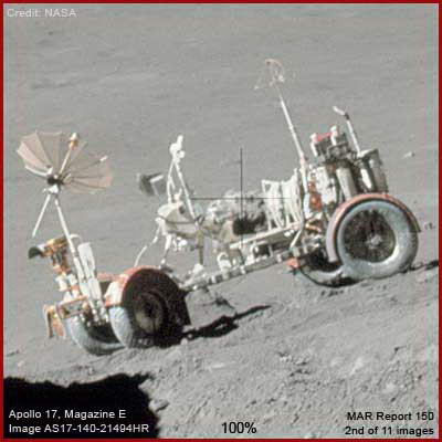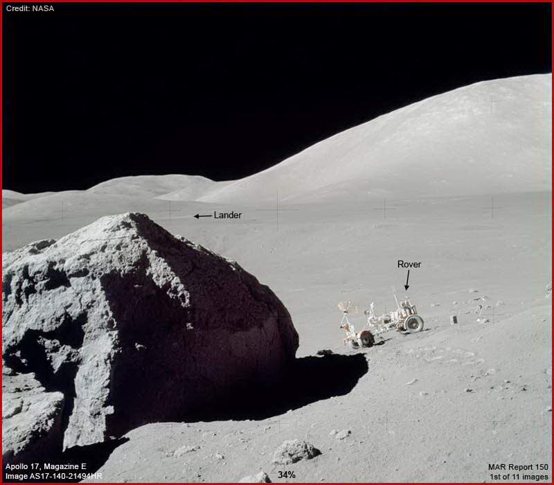 A fenti felvétel csupán kontext kép az AS17-140-2149HR jelű fotócsíkból, mintegy általános áttekintésül szolgálva, milyen a háttér és az egyes objektumok helyzete egymáshoz viszonyítva. Figyeljük meg a nagy sziklát az előtérben, a méretes hegyet a háttérben jobbról, valamint a sötét eget a bal felső sarokban. A holdautó, közvetlen a nagy szikla jobbján, az Apolló-17 küldetés során használták. A távolban, pontosan a szikla felett húzódó egyenes vonal fölött látható a leszállóegység, a holdautó természetesen onnan indult el. A halványan látható, tekintélyes bemélyedés, a maga enyhén lejtő oldalfalaival, a leszállóegység és a holdautó között a Henry-kráter. Fontos tudni, az Apolló-17 küldetés jelentette a holdraszállások utolsó állomását, s egyben a nyilvánosság számára legmélyebben áttekinthető és legtöbb tájékoztatást nyújtó küldetést, mely során asztronauták sétáltak a Holdon. Három űrhajós volt érintve. A parancsnok, Ron Evans, aki a Parancsnoki Modul pilótája volt, s a Hold körül keringett, az események ideje alatt. A két, Holdra leszállt űrhajós pedig Eugene Cernan parancsnok és Harrison Schmitt Holdkomp pilóta és szakképzett geológus egy személyben. A leszállóegység 1972. december 15-én érte e la felszínt és a két férfi 3 kiszállást hajtott végre, egyenként hét óra időtartamban. 110.5 kg holdi talajmintát hoztak vissza a Földre. A leszállási helye ennek a küldetésnek egy holdi Tenger széle volt. A tengerek a Holdon mélyen fekvő területet jelentenek, uralkodóan finom üledékes anyaggal kitöltve (regolit) és mindent ellepve, ellentétben a durvább, sziklás területekkel. A háttérben, 8 km-re látható magasföldek, a Tenger szélétől a „masszívum” nevet viseli, de az elnevezések nincs is különösebb jelentősége. A földi hegylábakkal hasonlíthatók össze. Az itt bemutatott felvétel a svéd, 70 mm-es Hasselblad kamerával készültek a két űrhajós jóvoltából, akik a felszínen tevékenykedtek, színes filmet használva. Igen, színes filmre, holott csak fekete és szürke árnyalatokat látunk a Hold felszínén. Ha valaki megnézi közelről a fenti felvételt, észreveheti, hogy egyedül a holdautó rendelkezik némi színezéssel. Ez a felismerés rendkívül fontos, alapvetően fontos a továbbiak fényében.