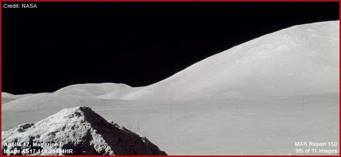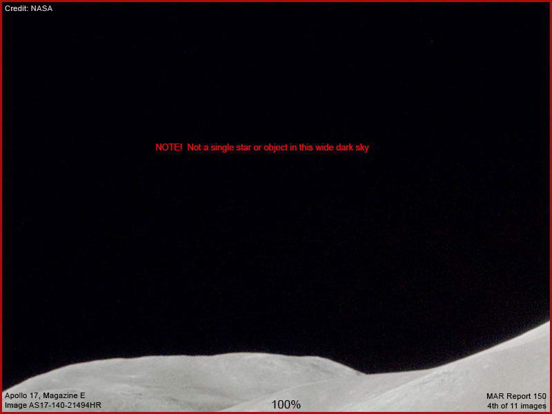A fenti, negyedik felvétel, az elérhető legjobb felbontásban mutatja a Hold fölé boruló égboltozat tekintélyes részét. Figyeljük meg, a létő világon semmi sem látható az égen, habár a láthatóság jelen esetben kristálytiszta, a világon akkoriban elérhető legjobb svéd fényképezőgép-lencséknek köszönhetően. Miközben mindenféle, a Hold felszínére vonatkozó vizsgálattal arra a következtetésre juthatunk, hogy egészen minimális színt érzékelhetünk csak, mondván, hogy csak a Nap számunkra látható fényes színképtartományát veri vissza, komoly vita és találgatás folyik a tökéletesen üres és fekete háttér vonatkozásában; a nehéz láthatóság mint érv, nem állja mega helyét. Továbbá, az Apolló-17 valamennyi fotója esetén általános jelenség a tökéletesen fekete ég. Az, hogy a fenti égen egyetlen csillag sem látszik, vagy bármiféle más objektum, teljességgel lehetetlen. Érdemes felidézni, hogy a méltán híres és rendkívüli tisztaságú felvétel a Földről, mely a „Kék Golyó” néven ismert, ugyancsak az Apolló-17 küldetése folyamán készült, azaz semmi probléma a fényképező-rendszerrel, vagy a filmmel. Elmondható, semmi sincs az égen, ami akadályozná a kilátást, a csillagos égi háttérnek tehát sokkal látványosabban kellene mutatkoznia a Holdon, mint a Földről, semmiféleképpen sem hiányozhatna, mint a mellékelt fotón látjuk. Továbbá, a sötét ég alapos vizsgálata során kiderül, semmiféle adat-elnyomásra vagy lefedésre nem került sor területén. Ezért az embernek semmi más lehetősége nincs, mint levonni a következtetést, ennek az égi háttérnek semmi köze a valósághoz. Logikus a felvetés, hogy semmi másról nincs szó, mint üres, fekete grafikus fedőrétegről, mely az égbolt megjelenését hivatott utánozni. Az egyetlen másik lehetőség az lenne, ha valamiféle magas technológiájú gát vagy képernyő lenne az égen a Hold körül, ami kifejezetten az ember számára látható sugarak áthatolását befolyásolná. Amennyiben a Holdon fejlet technológiájú civilizáció él, ennek a feltételezésnek lehet logikus alapja, azonban ki a csuda lehetett az, aki az elmúlt néhány száz évben használta ezt a képernyőt a földlakók megfigyeléseit befolyásolandó, a távcsövek számára hamis információkat szolgáltatva a Hold felszínéről. Soha ne becsüljük le a technológiai lehetőséget csak azért, mert nem birtokoljuk azt. Ha pedig egy hamis, mesterséges, üres égboltra tekintünk, akkor felmerül bennünk a kérdés, miért rejtették el a csillagos hátteret? Az első kérdés ami azonnal felmerül bennünk, hogy egyáltalán, tényleg a Holdról van szó? Ha pedig nem a Hold, akkor a holdi körülményeknek megfelelő csillagos ég rekonstrukciója igen nehéz feladat. Újra említsük meg, az Apolló-17 küldetéséről van szó, a sorban az utolsó holdi repülésről, azt tudjuk róla, hogy utána évtizedekre távol maradtunk a Holdtól, ez a körülmény pedig teljesen logikátlan és értelmetlen. A logikus álláspont az lenne, hogy a lakatlan(?) Hold az emberiség számára ugródeszkául szolgálva a további űrutak kiindulópontjává válik. Ehelyett nagy ívben kerüljük a helyet és rendkívül sebezhető űrállomást építünk, előreláthatóan igen gyenge várható eredmények mellett. Vajon miért e titokzatos félelem a Holdtól, miközben emberes küldetések zajlanak? Túl sok zavaró körülményt találtak a Hold felszínéről látható holdi égen, amit aztán nagy sietve el kellett rejteni? Túl sok zavaró dolog volt a Hold felszínén is, amit szintén gyorsan el kellett rejteni? Most menjünk vissza az első felvételhez és vizsgáljuk meg a holdi háttérben látható hegyeket sokkal kritikusabb szemmel. Ez a szürkés, viaszosan sima felszín tényleg valódinak tűnik? Nem könnyű elfogadni.