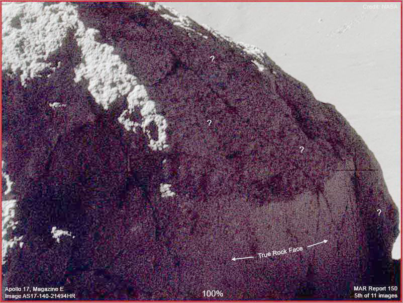A fenti, ötödik felvétel a méretes szikla egyik darabját mutatja, jelen beszámoló panoráma-képének bal oldali előteréből. A szóban forgó részt jelentősen világosabbra vettük a jobb megfigyelőség végett. Vegyük szemügyre a szikla árnyékos oldalát. Habár rendkívül nehéz értelmezhető részleteket kivenni ezen az árnyékos területen, azonban szeretném felhívni a figyelmet a sziklafelszín alsó, függőleges részére, két nyíl mutat rá, valamint az „Igazi sziklafelszín” felirat. Figyeljük meg, a sziklafal ezen része világosabb színű, ami tipikus a természetes geológiai formák esetében. A felirat fölött, ahol a kérdőjelek láthatók, figyeljük meg, a szikla felszín inkább fényelnyelőnek látszik, és valamivel be van fedve, amint szögletes lejtőt formázva aláfut a szikla csúcsától. Most figyeljük meg a szikla jobb szélső részét, közvetlenül a felirat mellett, ahol újabb kérdőjel található, és vegyük észre, mintha valami körbe lenne csomagolva, és bevonná a jóval inkább fényvisszaverő szikla felszínét. Lehetséges lenne, hogy valamiféle rendkívül sűrűn növő gomba típusú élőlénnyel lenne dolgunk, mely sokkal inkább mutat sziklakinézetet, amikor a Nap fényesen süt rá, például a bal oldalon? Nem egyértelmű a bizonyíték, ám nagyon szuggesztív, legalább annyit megér, hogy az ember meggondolja.