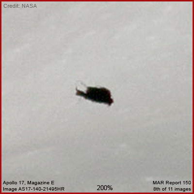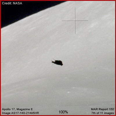 A fenti hetedik és nyolcadik felvétel közelebbi rálátást enged az objektumra. Sajnálatos módon, az az oldala, amelyikre ráláthatunk, árnyékba burkolózik, mindenféle részletet elrejtve, mindösszesen a tetején kissé megcsillanó napfényt vehetjük ki. A közetlen ezelőtt és ezután készített felvételen nyomát sem látjuk ennek az objektumnak, sehol. Ezért bátran feltételezhetjük, az objektum repült, méghozzá igen nagy sebességgel. Szembesüljünk vele, kétség sem férhet hozzá, UFO-t figyelhetünk meg a Holdon 1972-ben. Teljességgel egyértelmű, mesterséges alkotás. Figyeljük meg testes, ipari formáját (a pontos alakot talán eltorzítja az árnyék-hatás) és bármiféle, a repülés megkönnyítésére általunk ismert alkalmazást az objektum testén. Ez arra utal, a meghajtásának bizonyos elemei ismeretlenek számunkra, teljességgel független a légkör sűrűségétől és a repülés sebességétől. Figyeljük meg, mintha vékony elemek kimeredeznének belőle. Lefogadható, ez az objektum legalább akkora, mint a Holdautó (alatta látható és az előtérben sokkal közelebb található hozzánk), ám sokkal testesebb. Lehetséges lenne, hogy miközben Cernan és Schmitt űrhajósok a felszínen vizsgálják és fényképezik a környezetüket (az igazság nincs teljes egészében közzé téve), valaki más közelről megfigyelte őket, akiről úgy gondoljuk nem is létezik? Ha ti lennétek e a két ember egyike, és valóban egyedül lennétek a Hold felszínén, azon aggódva, hogyan sikerül majd a hazatérés, és teljesen felkészületlenül érvén benneteket elrepülne ez az objektum felettetek ennyire közel és alacsonyan, jóval közelebb, mint amekkora távolság a Leszállóegységtől elválaszt, az egyetlen lehetséges úttól hazafelé, nem gondoljátok, hogy alaposan betojnátok? Lehet, túl nagy lépést tettek meg és csak egy kissé idegeskedtek. Végül is ez volt az utolsó emberek küldetés, mely során leszálltak a Holdra a mai napig, legalábbis a nagyközönségnek ezt adták be. A korai Apolló-küldetések során számos beszélgetés zajlott le a földi irányítóközpont és a Holdon tevékenykedő űrhajósok között, nagyon izgatott beszélgetések, igencsak zaklatottan beszéltek ufó-megfigyelésekről és egyebekről, míg lenyugodtak és át nem tértek a kódolt csatornákra vagy kifejezésekre. Ezért az Apolló-17 űrhajósai pontosan tudták, mire számoljanak. Úgy gondolom, valamennyien megérthetjük, miért távolították el ezt a rendkívül szokatlan objektumot néhány nyilvánosan elérhető fotóról. Csak örülhetünk neki, hogy valaki kellően hanyagnak bizonyult és engedte kicsúszni, s mindenki számára jelenleg is elérhetővé tette a NASA Apolló-17 Fotó Könyvtárába. El sem tudom képzelni, miként lehetséges az, hogy senki sem jelentkezett még ezen objektum felfedezésével, semmiféle publikációban nem jelent meg, s egyúttal a legcsekélyebb hivatalos magyarázat sem hangzott el eredetét illetően. Ha nem ez lenne a helyzet, akkor kérem előállni vele, hogy itt feltüntethessük, hiszen rendkívül kíváncsi lennék arra, miként állnak az UFO-kérdéséhez, vagy csak a szokott nemtörődömséggel kezelik.