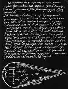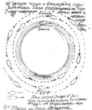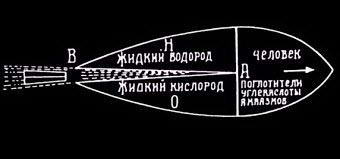 „Képzeljük el… Egy meghosszabbított fémkamra… a tervek szerint nemcsak különböző fizikai szerkezetek megvédésére alkalmas, hanem emberi pilótáéra is… A kamrát, részben, nagy mennyiségű, összekeverve robbanó elegyet alkotó gáz tölti ki. Ez a keverék, egy meghatározott ponton, meglehetősen egyenletesen, forró gázként áramlik végig a csövön, lángolva csapódva ki a trombita formájú cső végén. Ezek a csövek hosszúkásan vannak kialakítva a kamra falai mentén. A cső szűk végében a robbanékony anyagok összekeverednek: ide vezetjük be a sűrű, éghető gázokat. Ezután jelentős ritkuláson és hűlésen mennek keresztül; a gázok az űrben robbannak; aránylag nagy sebességgel és fényt kibocsátva, a cső másik végén. Tisztán, biztos körülmények között, akár egy lövedék, amely megy, mint egy rakéta." - Ciolkovszkij