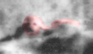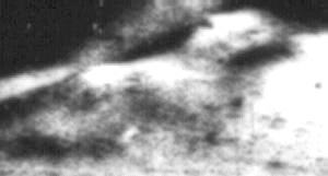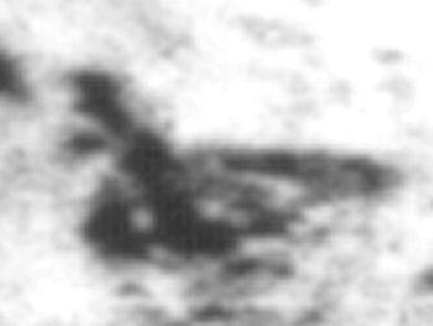 Egy újabb struktúra, pontosan olyan, mint a „Bújócska”. Figyeljük meg a hasonlatosságokat az objektumok között. Ez a NASA apolló-16 felvételeiből való. Az égen van, pontosan a kamera felett, ezen a felvételen: AS16-111-18035HR.jpg. a mellékelt képrészleten pontosan ugyanaz az helyzete, mint az eredetin. Alant két képet helyeztünk el az összehasonlítás kedvéért. A NASA felvételén látható a megszokott célkereszt, ahogy a nagyítás növeljük, az is változik természetesen. Úgy gondoljuk, valami probléma lehetett, mert normál nagyításban meglehetősen vékonynak mutatkozik, viszont a felvétel igen nagyfelbontó-képességű, a nagyítás tehát tisztán kivehető.)