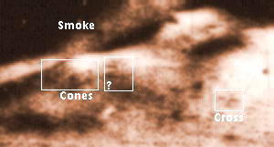Baloldalt a képen újabb kúp alakú objektum látható, feketés füstöt eregetve.
