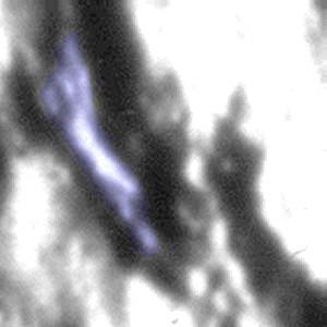 Valójában sziklaalakzat, egy alakzat árnyéka. A jobb oldali árnyék szépen illeszkedik forrásához, az árnyék bal oldalán. A jobb oldali árnyéknak más a forrása. A kerekded objektum a kép alsó részén meglehetősen szokatlan.
