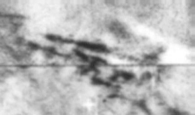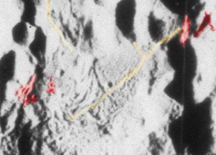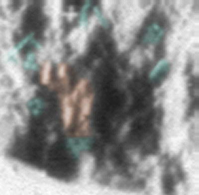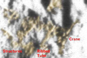 Vessünk egy közelebbi pillantást erre a területre az eredeti fotón. Valamennyi figyelemre méltó alakzatot színkiemeléssel jeleztünk. A zöld színnel jelzett részek a boltíves alátámasztások. A barnával jelzett objektumok valamiféle épületek, míg a sárgával jelzett részeken füstöt vagy párát látatunk. A boltívek felett egy egészen rendkívüli forma látható, érdemes az eredeti fotót használni jelentősebb nagyítás elérése végett.