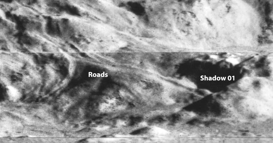 Az képre ha valaki távolabbról tekint, felismerhet egy fehér „utat”, mely a kép bal alsó sarkából indulva mintegy 45 fokos szöget tartva a jobb felső rész felé halad, eközben metszi a különleges „”Torony” térségét a maga még különlegesebb árnyékával. Tekintsük rá a „H” jelű területre a rejtélyes alakzat további részleteinek megfigyelése érdekében.