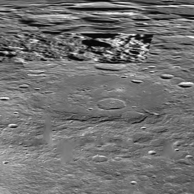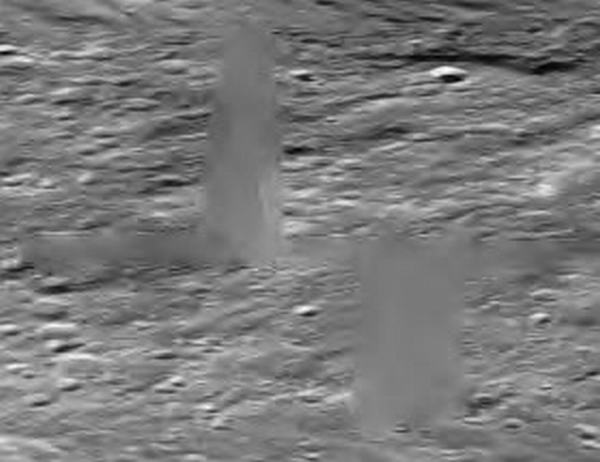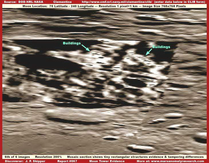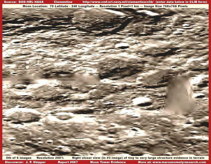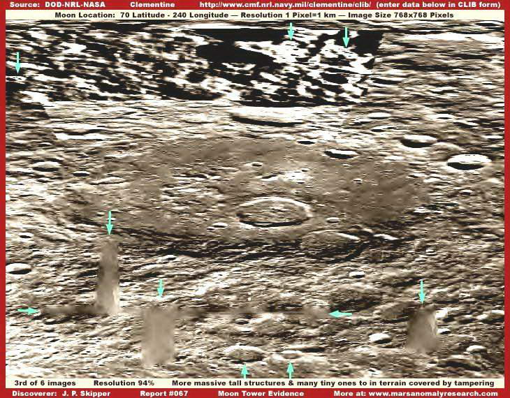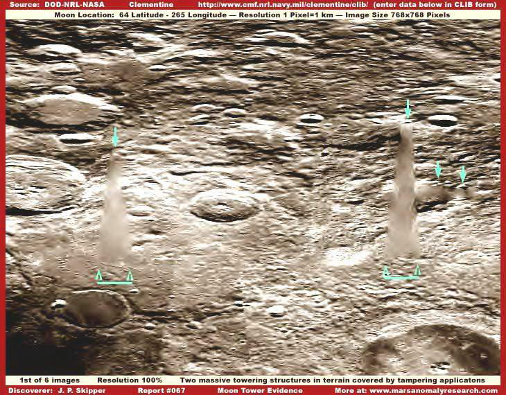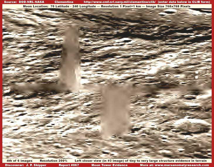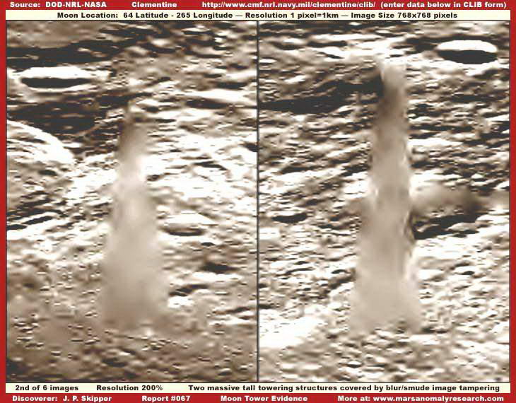 A mellékelt felvételek közvetlenül az 1994-ben tevékenykedő, a Haditengerészet által felbocsátott, Clementine nevű katonai mesterséges hold hivatalos archívumából való, pontosan a nyilvánosságra hozott felbontáson, a képen pedig két, igen nagy, toronyszerű objektumot látunk. Habár rögtön észrevehetjük a képhamisítási technika alkalmazását rajtuk, a ködösítést és az elmaszatolást, amiatt a szerkezetekből semmi részlet sem kivehető, még nem jelenti azt, hogy semmi se lenne ezeken a felvételeken, amit elemzés alá ne vehetnénk. Szerencsések vagyunk abban a tekintetben, hogy az 1994-es képhamisítási színvonal eljárása során egyenként vették kezelés alá ezeket a hatalmas objektumokat, nem a manapság alkalmazott igen kifinomult technikát vetették be, mikor is a teljes területet hamis felszínnel (mátrixszal) vonták volna be, miként azt az MGS MOC marsfotói esetén teszik. Az akkori technikának köszönhetően tehát elmondhatjuk, amit látunk azok nagy valószínűséggel nagyméretű, igen magas, függőlegesen álló tornyok, melyek mellett bármilyen ismert földi épület eltörpülne. Az objektum szélesebb aljánál kezdődik a hamisítási technika alkalmazása; alakja mellesleg igen jellemző a földi felhőkarcolókra, miként felfelé haladva egyre keskenyebb. A Holdon azonban sokkal nagyobbak és messze magasabbak, mint bármi hasonló a Földön, kétségtelenül, a Hold kisebb gravitációjának köszönhetően. Fordítsuk figyelmünket közvetlen az objektumok közelébe, rögtön feltűnik, nem vetnek árnyékot! Első benyomásunk az lehet, talán szó sincs semmiféle függőleges tornyokról, sokkal inkább egy fedési technikával van dolgunk, amit vízszintesen vittek fel az alapfelvételre, elrejteni annak részleteit. A tornyok környezetében mindenhol láthatunk árnyékokat, ám van velük egy kis gond, egyes helyeken ismét csak képhamisításnak vetették alá őket, a jelenleginél láthatóhoz képest sokkal jobb felbontáson, s aztán rontották le a felbontást. Ezt az eljárást hívják szakmai körökben „térkép”-típusú eljárásnak, a képeket a maguk eredeti felbontásában soha sem tárják a nagyközönség elé; mindezt megtetézik még a távolság manipulálásával, amikor is a felszínt úgy állítják be, mintha a fotó nagy távolságból készült volna. A két technika együttes alkalmazásának köszönhetően megjelennek a fotókon a kicsiny, szögletes geometriai formák, ha alaposan megnézzük, a teljes képfelület tele van velük, különösen a kolosszális objektumok közelében. Az egyedi objektumokon való térkép-típusú technika alkalmazása során kimaradnak a fényt erősebben visszaverő részek, s amikor a felbontást elrontják, a hivatalosan kiadott szintre, akkor létrejön a sok-sok parányi szögletes forma, miként az látható a mellékelt felvételeken is. Ha valaki nagyon közelről megnézi, bal oldali torony bal oldali részét, akkor könnyen észreveheti, valamennyi kis forma mellette, szögletes. E technika alkalmazása következtében feltöredeznek az egyébként szabályos árnyékok, akár természetes, akár mesterséges objektumok közelében a felszínen (bár a tornyok esetében bizonnyal szándékosan távolították el azokat), viszont megmaradnak a szabályos struktúrák tetejének fényt jobban visszaverő részei. A szélein hosszú egyenes vonalakat tartalmazó, sötét árnyékokat az automatikus képhamisító számítógépes program kidobja, hiszen felismeri azok szabályos geometriáját, és alkalmazza valamelyik szokásos fedőtechnikát. Amikor az eredeti, nagyfelbontású képen végrehajtották valamennyi hamisítási eljárást, a felbontást elrontják, ezzel is azt az illúziót keltve, mintha a felvétel nagy távolságból készült volna, eközben viszont a tornyok a kép többi részétől eltérő digitális formát öltenek. A felszín ködös/elmaszatolt színeit alkalmazták a tornyokra is. Amikor a legnagyobb objektumok lefedése is megtörtént, a felbontást még inkább elrontják, azaz, mintha a kép még nagyobb távolságból készült volna, az elkészült végeredményt pedig nyilvánosságra hozzák, miként itt is látható. Ez a látszólag igen nagy távolságról készül kép – az eredeti képfelbontáshoz képest -, már teljesen lehetetlenné teszi, hogy bármit is alaposabban megvizsgálhassunk eredeti méretében; a hivatalosan kiadott felvételen pedig teljesen összekeveredik a valós és a hamis részletek halmaza. A távolsággal való manipuláció igen hatékony technika, a normális méretű objektumokat erősen lekicsinyíti, felismerhetetlenné teszi, ráadásként a ködösítési és/vagy maszatolási technikával szinte tökéletes eredményt lehet elérni, a tájat uraló hatalmas tornyok azonban kifogtak a számítógépes programon, túl nagynak bizonyultak számára, így azok továbbra is észrevehetőek maradtak. Ezért a kép alapszínét kissé sötétebbre vették. Ha a jelen képre felhívjuk a figyelmüket, akkor már előre fogadhatunk abban, hogy védekezésként előadják, a Clementine űrszondának nem a színek és a visszaverődések pontos megörökítése volt a célja, nem arra tervezték, hogy felismerje a felszín élet átmeneteit, hanem arra, hogy a fényvisszaverődésekben előforduló pontos különbségeket érzékelje. Természetesen ez a magyarázat megfeledkezik arról a tényről, hogy mindössze néhány egyszerű képfeldolgozási eljárás alkalmazása révén a felbontást kissé közelebb tudjuk vinni az eredetihez, némi kontrasztnövelés és világosítás révén a kép kissé élesebb lesz. Természetesen, ha az eredeti élesség nem lett volna valamilyen szinten jelen a képen, mindezt nem lehetett volna végrehajtani. Ez a tény bizonyítja, a eredeti képélességet szándékosan lerontották. De ezen nem is kell különösen m