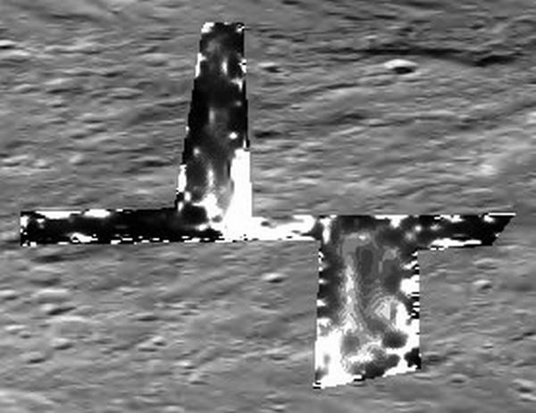 A fenti képen kitűnő példát láthatunk fotómontázs készítésére. A nagy hírveréssel beharangozott Apolló-fotógyűjteményből való. Megtudhattuk, több 10.000 Apolló felvételt tesznek közé az Interneten. Nos, a szkeptikusok már eleve sejtettek valamit... Ugyanis a több 10.000 fotó kb. negyedrésze a Földön készült, másik negyed része a leszállás perceit örökíti meg, további negyedrésze stúdiófelvétel a "Holdról", további negyedrész pedig fotómontázs, mint ez is. Kitűnően látható a színes Apolló űrhajó, amint repül a fekete-fehér Hold előtt. A montázs készítői még arra sem figyeltek oda, legalábbis azokban az esetekben, ahol a Hold horizontja és a világűr is látszik, hogy abban az elrendezésben egész egyszerűen az Apolló űrhajó el sem helyezkedhetett a Holdhoz képest... Több felvétel egybehangzó elemzése révén igazolható mindez. A legvalószínűbb forgatókönyv szerint a Hold kutatásának kezdetén valamit felfedeztek ott, ami miatt távol kell tartanunk magunkat tőle évtizedeken át, és ez a legfontosabb titok. Miért? Minden bizonnyal azért, mert kicsit, vagy egyáltalán semmit sem tehetünk az ügy érdekében. Kétségtelen, a Mars kutatásának folyamata is ugyanezt a végkifejletet eredményezte. Semmiféle kényelmetlen műszerezettség nem engedélyezett. És semmiféle kényelmetlen küldetés sem, akár a Hold, akár a Mars vonatkozásában, csak olyanokat, melyek nem a legkorszerűbb berendezéseket hordozzák, azok eredményeit is a legnagyobb titkosság övezi, és ez a fő ok, ami miatt az emberes küldetésekről szinte hallani sem akarnak, vagy a távoli jövőbe helyezik, különböző mondvacsinált kifogások hangoztatásával. Néhány szkeptikus úgy próbálja beállítani az alant látható mértani formákat, mint a kép pixelezettségi hibáját. Ha így lenne, akkor semmi más teendőnk nincs, mint közelebbi pillantást vetni a simább részekre és megnézni a képhamisítási beavatkozások területeit is (ezek változhatnak, attól függően, mit akarnak velük éppen elrejteni), valamint a határterületeket; a dolog teljesen tiszta és letagadhatatlan, semmiféle pixelezettség nem látszik például a tornyokon. A pixelezettség a túl erős nagyítás eredményeként jelentkezik, ekkor jelenik meg a pixelezettségi háló, s olybá tűnik, mintha a kép teljes egészében szögletes elemekből épülne fel. Ha tényleg ez történne, akkora szögletes elemek uralnák teljes egészében a képet, nemcsak néhány kis részét, így viszont szó sincs pixelezettségi hálóról, annál inkább geometriai alakzatokról. Ez az igazság, és lehet bármit mondani, nem változtat ezen. Továbbá, bárki, aki rendelkezik grafikus programmal önmaga számára is bebizonyíthatja, hogy a pixelezettség elhanyagolható, ha elkezdi nagyítani az eredeti, hivatalos fotót. Ha valaki az itt megjelölt nagyítási szintre állítja be a gépét (mindig hangsúlyozzuk), semmiféle pixelezettséget sem fog látni a nyomokkal kapcsolatban. Azonban ha jelentősen tovább nagyítja, akkor természetesen feltűnik az igazi pixelezettség mértani blokkokból álló rendszere. A természetes pixelezettség megjelenése messze azon a ponton túl van, mint amilyen nagyítást itt alkalmaztunk, az itt bemutatott képek esetén a pixelezettség, mint olyan, szóba sem jöhet magyarázatként.