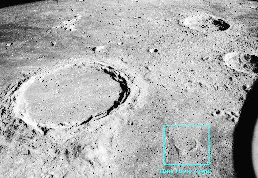 Ez a kép a kráter egy részét mutatja, ahol a „Méhkas” elhelyezkedik. 1971. július, az Apollo-15 felvétele.   Érdekességként meg kell jegyezni, hogy sok UFO-kutató használja ezt a képet bizonyítékként a Holdon megtalálható különleges alakzatokra, nevezetesen a „Szögletes” formát a kráter jobb felső oldalán.