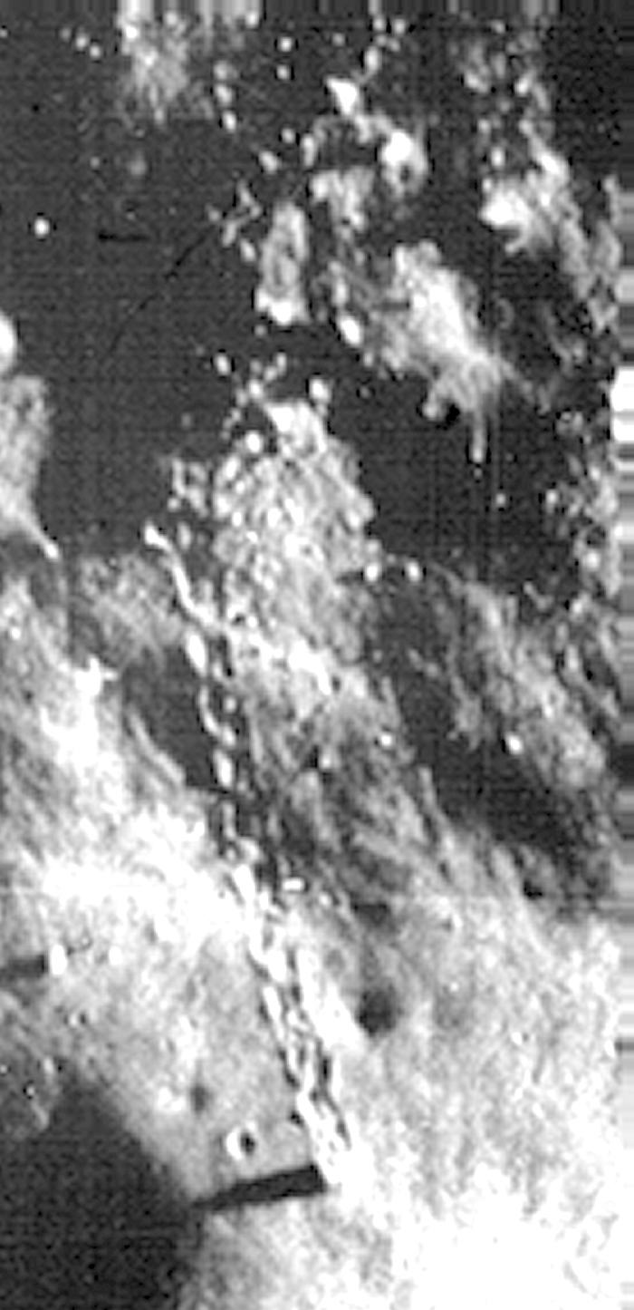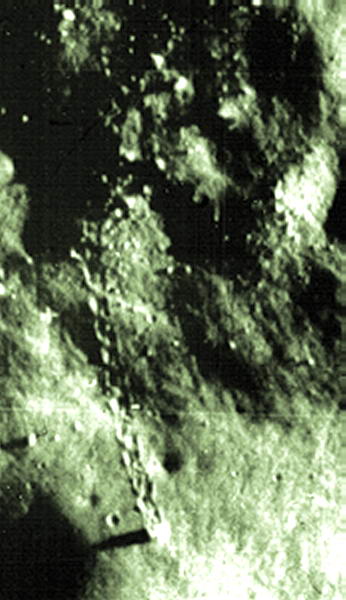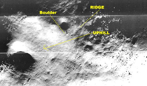 Luner Orbiter 5 felvétele egy sziklatömbről (a kép közepétől kissé jobbra), mely legördült és lecsúszott egy lejtős hegyoldalon, nyomot hagyva maga után a Hold felszínén. A helyszín a Vitello kráteren belül van, láthatóak a történés nyomai, a hold felszínén érvényesülő gravitáció hatása. A holdi felszín változásaiért alapvetően a meteorit- és a mikrometeorit záporok tehetők felelőssé. Észak felül található.
