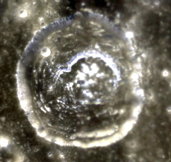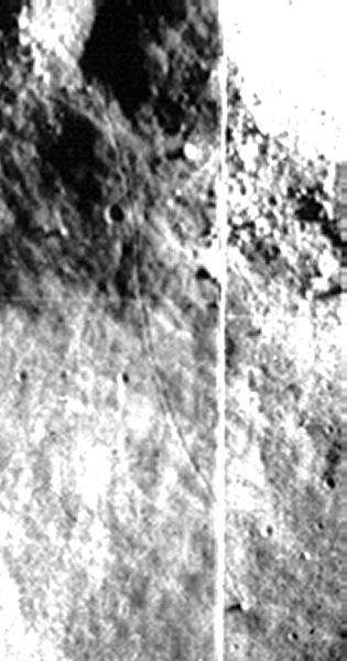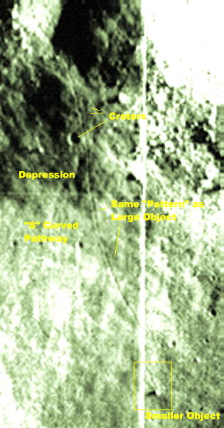 Megjegyzések: Amit itt meg kell figyelnünk, az a következő tény: a nyomvonal „emelkedik” és cikk-cakk alakban halad, erről az árnyéknyomok egyértelműen bizonyítékot szolgáltatnak. Aztán azt is, hogy a nyomvonal elhajlik, nyilvánvaló módon áthalad egy hegyháton, egybemélyedésen, és a nyomot hagyó objektum sikeresen elkerül, hogy beleguruljon két kráter valamelyikébe. Habár a kép felső részén a bemélyedés sötét, a fotón a nyomvonalat követve nyilvánvalóvá válik, hogy erről a részről indul ki, és kanyarodik ki később a fényre. Az objektum felszíne erőteljesebben veri vissza a napfényt, mint bármi más a környezetében, erős fénye miatt semmiféle részlet nem látható rajta, sőt, megjelenése egyenesen csillagszerű. Az általa vetett árnyék hosszú, majd egy kilométer. Összehasonlítva ezt az árnyékhosszat a környező objektumokéval, nagyon magas lehet. A Nap szögének pontos ismerete híján, erről nem tudunk pontosabban nyilatkozni, az objektum átmérője azonban 140 méter lehet. Ezt az értéket a Vitello-kráter átmérőjére megadott 42 km-es adatból vettük, igen különleges, fehér központi része eszerint nagyjából 10 km-es. A többi adatok a pixelek méretőből kalkuláltuk ki, és nagy pontosságúak. Az elmúlt néhány hónapban megpróbáltunk néhány igen elgondolkoztató rendellenességet bemutatni a Holdon, és arról, hogy a NASA nem igazán becsületesen tárja a nyilvánosság elé, mi is zajlik ott. Ami a legkülönlegesebb számomra, itt az ATS listán is, hogy ha az emberek szembesülnek ilyen teljesen egyértelmű és nyilvánvaló tényekkel, hajlamosak azt teljes mértékben figyelmen kívül hagyni. A NASA azt állítja, legördülő szikláról van szó. Nézzük meg közelebbről… nézzük meg a pályáját, mely felfelé kapaszkodik… gondoljunk a méretére és a távolságra, amit megtett… És mindezek ellenére a legtöbb ember teljes lelki nyugalommal könyveli el hitelesnek a NASA magyarázatát, miszerint ez egy szikla, miközben soha és semmiféle magyarázattal nem szolgáltak arra, hogy egy háztömb méretű szikla miként képes hegynek fel és hegynek le gördülni, kikerülni mélyedéseket és árkokat.