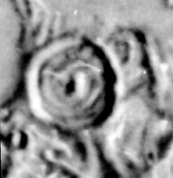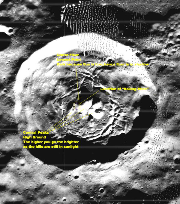 A kép közepén a fehér térség a Központi Hegyvidék, a kráteren belül. A korábban beillesztett vázlat bemutatja a pontos tájolását. A sötét rész a Hegyvidék felett a kráter feneke. Mivel a napállás alacsony ezen a felvételen, a kráter feneke sötét, miközben a csúcsok továbbra is napfényben fürdenek.
