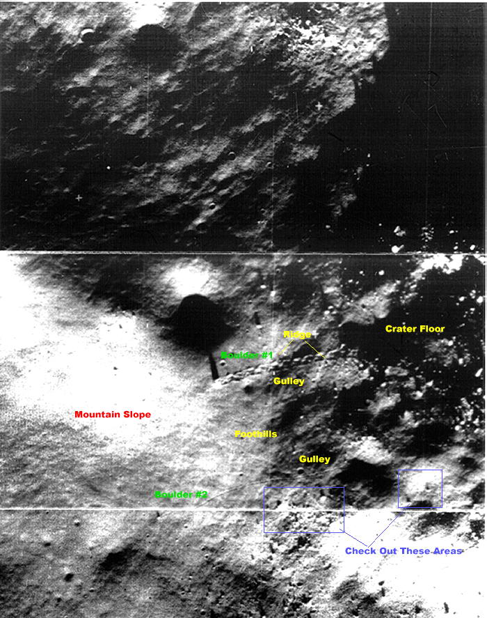 A felvételről egyértelműen leolvasható, hogy a kőtömb a kráter ALJÁRÓL indul, átvág egy megtermett hegyháton, azután hegynek FELFELÉ halad, elkerülvén, hogy beleguruljon egy jól kivehető mélyedésbe, abba, amely felé igen hosszúra nyúlt árnyéka is mutat. Alant láthatjuk a legnagyobb nagyítást, felcímkézve valamennyi völgyet és hegyhátat, melyeket a két legnagyobb „kőszikla” keresztez, a maguk meglehetősen különös kinézetű hátrahagyott mintázatával. Akik szeretnének még további érdekességeket felfedezni, javasoljuk vizsgálják meg alaposabban a kék téglalapokkal jelzett területeket…