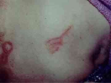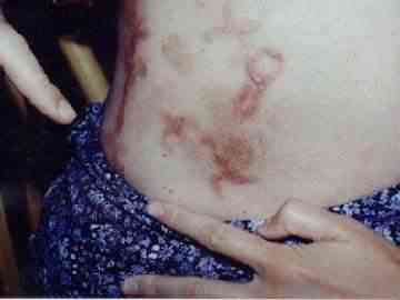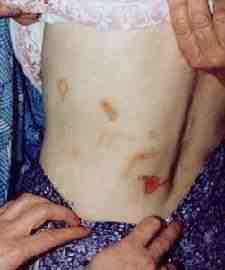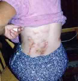 A fotón látható ez a bizonyos két lyuk. A különlegessége a földnek az, hogy teljes mértékben csíramentes volt! Ez önmagában meglehetősen különös, hiszen az Antarktisz több km vastag jégpáncélja alatt sincs csíramentes föld. A föld feltörését erős hangjelenség kísérte, s közben kénes szag érződött. (Tudni kell, ezen a vidéken gyakran fordulnak elő spontán metánfeltörések, a talaj csíramentességét azonban ez nem magyarázza.) A két lyuk mintegy 6 méternyi kábelt nyelt el, amikor a mélységét próbáltuk meghatározni. A talajmintavételre csak korlátozott lehetőségeink voltak, hiszen a néni egyszerűen kidobta a földet. A dolog tehát így kezdődött, s persze nagy riadalmat keltett a néniben. Ezután következett a csengő éjszakai megszólalása, a tv éjszakai bekapcsolódása, s a "kiesett idő" élmények. A néni egyik fia Pakson atomfizikus, s próbált utánajárni a dolgoknak, mert féltette édesanyját. Amikor a helyszínen töltött néhány éjszakát ő is tapasztalhatta a tv bekapcsolódását, holott a készülék a konnektorból is ki volt húzva! A néni egyszer az udvarán ébredt fel egy körtefa alatt az éjszaka kellős közepén. Az eső szakadt, de ő teljesen száraz maradt. A lakása kulcsra volt zárva, s a kulcs a zárban belül volt. Átment a másik fiához hálóingben, s megkérte, hogy segítsen neki bejutni a saját házába. Az kissé furcsán nézett rá, amíg meg nem látta az ajtóban belül lévő kulcsot. (A néni másnap azonnal kivágta a körtefát.) Nem tudott mit kezdeni ezekkel a jelenségekkel egészen addig, amíg a lábai szárán egy-egy piros pont meg nem jelent, s ehhez a testi jel felbukkanásához már éjszakai élmény is társult. Idézzük őt: "1992 tavasz. A lábam mindkét oldalán különös piros folt lett, tele apró piros pontokkal, mint a tűszúrás. Elmentem vele orvoshoz, azt mondta, nem tudja mi ez. Adott rá kenőcsöt, soká múlott el." "Nem akartam tovább írni, de most fura dolog történt velem. Megint újat láttam és talán ott voltam, mert ez nem álom" "Ezen a napon sokan láttak valami különös dolgot kint. Én este merem voltak csak. Reggel tudtam meg, akkor mondtam, talán nálam is ez a dolog volt. Akkor jöttek a helyi tv-től. Később már meg is nyugodtam, hogy nem képzelődöm, mert többen is láttak hasonló dolgokat. És mivel különböző jelek vannak rajtam, ami soká múlik el, és fekete marad a helye, később is még nagyon soká, hogy ez mi, jó lenne tudni, de gondolom ehhez okos ember kell, az a jó, hogy az oldalamon van, hogy még én alig látom, másként talán még azt gondolná a családom én szórakozom, mert ők tudják, ezzel nem nagyon kell dicsekedni, mert ki tudja mit gondolnának rólam." "1993.IX. Ez megint leírnivaló. Valahol voltam, mondják, üljek le arra a fényes valamire. Nagyon vékony volt, úgy kapaszkodtam. Még reggel is fájt az ujjam. Ekkor volt az, amikor nagyon féltem, mert mikor lenéztem, nagyon mély feketeség volt, és ott mozogtak valamik. Egyszer azután csak lepottyantam, és akkor ébredtem fel a kertben kint. Ilyen még sose volt. Azok a kis valami emberkék különben nagyon nézik az embert, olyan érdekes jóságos érzéssel rendelkeznek, mert mindig hallom, "ne félj", csak megszólalni nem tudok, hogy hol vagyok és mért vagyok itt. Másnap egy nappal előbbre gondolom az időt és borzasztóan előbbre dolgozom az időt. És borzasztóan iszom a vizet. Nem tudom mi lesz a vége minden esetre írom a különös dolgokat, talán majd valamikor megfejtik ezeket a dolgokat. Majd ha meghalok, odaadom valakinek, akit érdekel a dolog." "1993.XII.hó. Nem tudom mért ér ez a sok furcsaság. Nagyon szép helyen voltam, olyan zene volt, amit még soha nem hallottam, és nem is tudom honnan jött. Többen is voltak ott, a hangjukat nem ismertem, de most akárhogyan gondolkozom, nem jut eszembe kik lehettek. Csak ültem és néztem, azután szembe jött egy kis valaki és oldalt fordított a széken. Kicsit fájt az oldalam és olyan puffanás-szerűen felébredtem. Csupa víz voltam, de csak deréktól lefele, és az egyik lábam nem. Szinte hihetetlen, az oldalamon van valami megint, csak nem látom jól és így nem is tudom, csak mondás szerint hogyan néz ki. Jó volna már, ha vége lenne a dolognak." A jelek némelyike meglehetősen szabályos. Keletkezésük a következő: általában hathetente jelentkezik egy-egy éjszakai ufóélmény. Másnap a néni hátbőre egy helyen megkeményedik, a mozgás közben a felhámréteg felrepedezik, és vérzések következnek be. Erre a doktor ír fel felhámnövesztő kenőcsöt. A "seb" mintegy hat hét alatt meggyógyul, s egy jellé alakul, ami egyben bőrpigmentáció-változást is hoz magával. Az egyes jelek évekig megmaradnak, általában csak egy következő jel takarja el. A bal oldali kép 1994 januárjában készült, a jobb oldali 1995 májusában, hasonlóan a két alatta lévőhöz. Megfigyeltük, hogy ha a néni megsebesül (megvágja vagy megégeti magát), azok a sérülések egészen másként, sokkal gyorsabban és normális módon gyógyulnak. Az alábbi képeken érdemes megfigyelni a jellegzetes madárformákat. A bal oldali kép keletkezési ideje 1995 május! Ha valaki emlékszik rá, pontosan ekkor keletkeztek a budaörsi repülőtéren a hajszál pontosan ilyen alakú madárformák. Minő véletlen egybeesés... Azokat a madárformákat a műtrágyaszóró szórófeje lenyomatának titulálta egy budapesti ufókutató... (Persze azon a helyen nem is műtrágyázták a füvet, de ez a mellékes körülmény őt nem zavarta.) Az alábbi képet 1995 decemberében készítettük, látható, hogy a madarak elhalványultak, de ez annak is betudható, hogy tél volt, s a néni mindig fűtetlenül hagyta a konyháját és az előszobáját, csak éjszakára csinált magának egy kis meleget, így a bőrének vérker