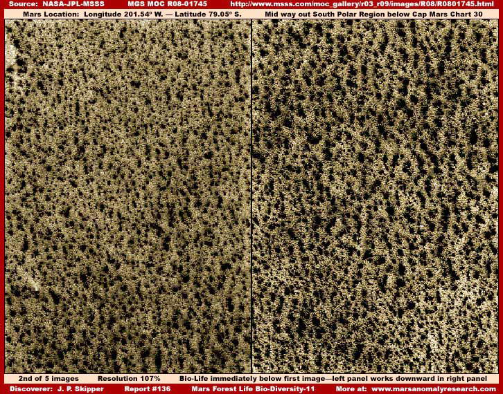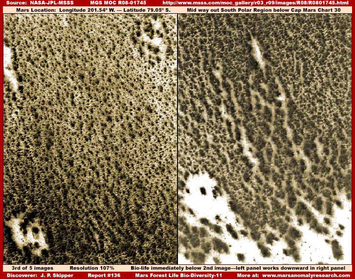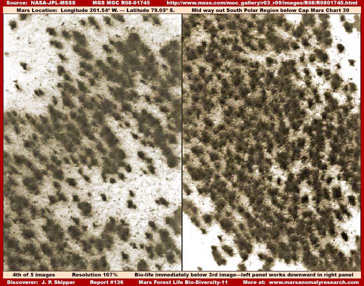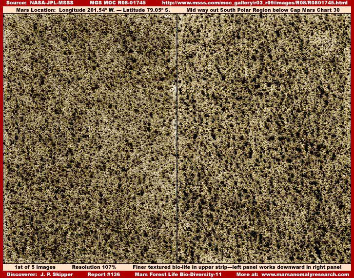 101. A marsi erdei élet biodiverzitása Ez a beszámoló egyetlen MGS MOC keskenylátószögű felvételt tesz elemzés tárgyává, nevezetesen az R0S-01745 katalógusszámút, s kissé eltér majd a megszokottól. A helyszín jócskán fél távon belül van a Déli Sarkvidék térségében, magától a jégsapkától kiesik, a pontos helyzetét megláthatjuk a 30-as számú marstérképen. Jelen írás a biológiai növekményekről szól, viszonylagosan jobb felbontásban vizsgálhatjuk a többi felvétellel összevetve, ahol nagyméretű biológiai növényformákat láthatunk. Ezt a fajta növényzetet igen könnyű elrejteni a műholdas képek meghamisítása révén, elég csupán a „távoli látvány” technikát alkalmazni, azaz a felbontással manipulálni egy kicsit, vagyis meglehetősen nehéz fél távról alátekinteni a helyszínre. A távolsággal való játszadozás a fotócsíkot fizikailag igen keskennyé teszi, s pontosan ugyanez a helyzet jelen esetben is. Ennek következtében nagyon könnyű a biológiai életnyomokat összezavarni, felismerhetetlen masszává tenni, a legkisebb egyedi részlet észlelhetősége nélkül. Skipper kutatta ezt az képi adatot, újra és újra átnézte, számolhatatlan ezerszer, de aztán tovább kellett lépnie, mert felismerte, a kép erősen tömörített a legtöbb megfigyelő számára ahhoz, hogy bármit is felismerjen rajta, és igen könnyen kétségesnek ítélik a látottakat. Azonban, a tapasztalatok halmozódásával egyes ritka esetekben grafikus tisztításnak alávetve a képet az értelmezhetőbbé válik, s ebben az esetben is pontosan ez a helyzet. A fotócsíkot a már megszokottnak tekinthető, a távolsággal és a felbontással manipuláló hamisítási technikának vetetették alá, emellett az erős tömörítésnek betudhatóan a fotócsík nagyítása is jelentősen bekorlátozott, gyorsan beleütközünk a pixelezettségbe. Azonban, a továbbiakban bemutatandó formák a finomabb textúrájuknak köszönhetően valamennyire mégis felismerhetőek maradnak a mindösszesen 107%-os nagyítást megengedő felvételen, eddig a mértékig áll ellent a pixelezettség megjelenése miatti szétesésnek. Amit itt bemutatunk az a már említett egyenes állású GIF fotócsík, annak is a felső része, kicsit feljavított változata, hogy némi részletet is kivehessünk rajta. A fotócsík teljes szélességében szerepel.