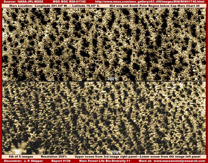 Miként az jól kivehető a fenti, ötödik, osztott képen, kissé közelebbi, 200%-os nagyítás mellett, a szóban forgó biológiai élet igencsak beszédes, nagyon nehéz letagadni, még a legfanatikusabb szemlélők részéről is. Hatalmas felkiáltójel ez az ismeretlen típusú biológiai élet, és még távolról sem lehet összekeverni semmiféle sziklák vagy talaj által nyújtott geológia képével. Újabb füstölgő fegyver tehát, vagy ha úgy tetszik, újabb szög a Mars bolygóról szóló hazugságok koporsójába, miszerint csontkeményre fagyott, halálos légkörrel rendelkező, porszáraz égitestről van szó, mely hosszú ideje már halott, vagy haldoklik. A fenti életnyomok Skipper készülő könyvéből valók, ám mégis előre bocsátotta inkább. Mintegy előhírnöke a tudós és akadémikus közösségek fő áramlatainak figyelem felkeltésére. Arra hívja fel a figyelmet, hogy tessenek figyelni! Az új paradigma már úton van. Aki nem fogadja el rossz oldalon áll, és később nagy meglepetésekben lesz része, és sokkal rosszabb helyzetbe kerül, ha az áramlat teljes erejéből nekilódul. A visszautasítókat, tagadókat, egész egyszerűen elmossa, elsöpri. Emlékezzünk rá, e változások arra késztethetnek egyes tudósokat, hogy kamera-rendszereket küldjenek a Marsra, ám gyakran elvesztik a józan eszük, és megtagadják a készülékek által sugárzott képek valós és helyes értelmezését. Vegyük szemügyre az 1-5 osztott fotókat, a szuper sűrű biológiai élet a fotócsík felső részén kezdődik, azután némileg finomabb megjelenést ölt, egyfajta mintázatot vesz fel, ahogy lefelé haladunk, azután elkezd felszakadozni, megjelennek különálló csoportok, mintha innentől kezdve egy másfajta kinézetű biológiai élettel kerülnénk szembe, a fotócsík alja felé, ahol eközben a jóval erősebb fényvisszaverő tulajdonságokkal rendelkező természetes geológia is megjelenik. Görgessük előre és hátra az 1-4 felvételeket és figyeljük meg, a biológiai élet sötétebb színben jelenik meg, mint a geológiai eredetű sziklák és a talaj, a fotócsík alján található természetes felszín sokkal jobban visszaveri a fényt. Ez utóbbi jellemvonás rendkívül fontos annak megértésében, mi is látható valójában a műholdas felvételeken, készüljenek azok akár a Marson, akár a földön, akár jól kivehetők, akár súlyosan meghamisítottak. A biológiai élet természetszerűen sötétebb, közel sem ver annyi fényt vissza, sokkal inkább elnyeli azt. E tulajdonság elterjedten jellemző az általunk megszokott földi biológiai élettel kapcsolatosan, hiszen már eleve úgy működik, hogy elnyelje a napfény bizonyos mennyiségű energiáját, belső életfolyamatai fenntartására. Teljességgel logikus, ha egy olyan égitest esetében, mint a Mars, mely ugye a Földnél hűvösebb, a biológiai élet még erőteljesebben igyekszik a napfény melegét hasznosítani, elnyelni energiáját, így harcolva és alkalmazkodva a zordabb körülményekhez. Ezzel párhuzamosan, a sziklák és a talaj részecskéi, akárhol is legyenek fellelhetők, az esetek legnagyobb többségében, több fényt vernek vissza. Például, ha valaki elrepül néhány déltengeri sziget felett, vagy csak a fotójukra vet egy pillantást azonnal észreveheti, hogy az igen erősen fényvisszaverő part menti homoksáv mennyivel világosabb színű, mint a fényt erősen elnyelő belső dzsungel, de még közvetlenül a vízparti rész is, ahol növényzet telepszik meg a tengerfenéken. Hasonlóképpen, ha valaki füves terület felett száll át akárhol, természetesen azonnal észreveszi útjaink koszos burkolatát, amint keresztül vág a réten, igen fényesen és erős fényvisszaverő-képességekkel jellemezhető, miközben a füves terület sokkal több fényt nyel el. Vannak persze olykor kivételek, de nagy általánosságban elmondhatjuk, igen ritka esetnek számít, amikor a természetes geológia fényelnyelő képessége meghaladja a növényzetét. Ha bolygónyi területeket vizsgálunk, ennek nyilván elsődleges szempontnak kell lennie. A mellékelt marsi alakzatok között mindkét forma jelen van és teljességgel nyilvánvaló, melyik-melyik. Ennek következtében egészen minimális az esély a két fő jellemvonással rendelkező terület összekeverése, azaz a fényt elnyelő élet és a fényt visszaverő geológia. Senki ne nézze a képeket csak futólag, hanem figyelje meg közelről, keresse meg a részleteket, főleg a második fotó jobb oldali és a harmadik fotó bal oldali részletén. Van bármi esélye annak, hogy bárki is összekeverje a marsi életformákat a közönséges marsi geológiával? Ehhez nem kell rakétatudósnak lenni! Az én számomra mindez egyértelmű és kézenfekvő. És önnek? Az egyetlen dolog ami nem stimmel ezzel a marsi alapú biológiai életformával a földivel való összevetésben az, hogy vajon milyen faj alkothatja, s milyen fejlettségi szintet képvisel. A földi biológiai életformák gyakran emberi beavatkozás eredményeként kerülnek egy adott helyre, s mint felhasználható forrásként szolgálnak, olykor durva környezeti beavatkozásokat követően, természetesen mindez kihatván a növényzet felülről látható megjelenésére. A marsi biológiai erdőségek viszont szemmel láthatóan meglehetősen gyakran nagyon sűrűek, minden rendelkezésükre álló helyet kitöltenek, igyekezvén a napfényt a lehető legnagyobb mértékben felfogni, tömöttségük következtében viszont teljes egészében eltakarják a természetes geológiát a szemünk elöl. E tulajdonsága miatt régi telepekre gondolhatunk, s hangsúlyosabban szóba kerülhet az intelligens élet, vagy intelligens környezeti tényező. A kutató talán megértheti, miként próbálja a csak önmagával foglalkozó titkos hatalom megkötni az emberek gondolkodásá