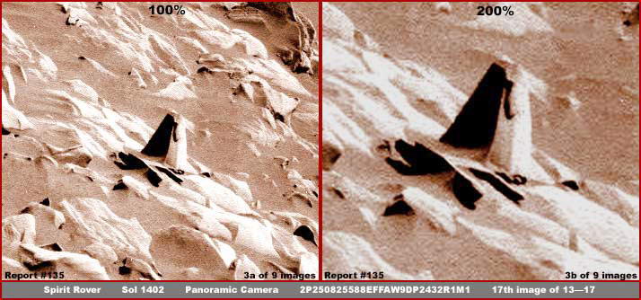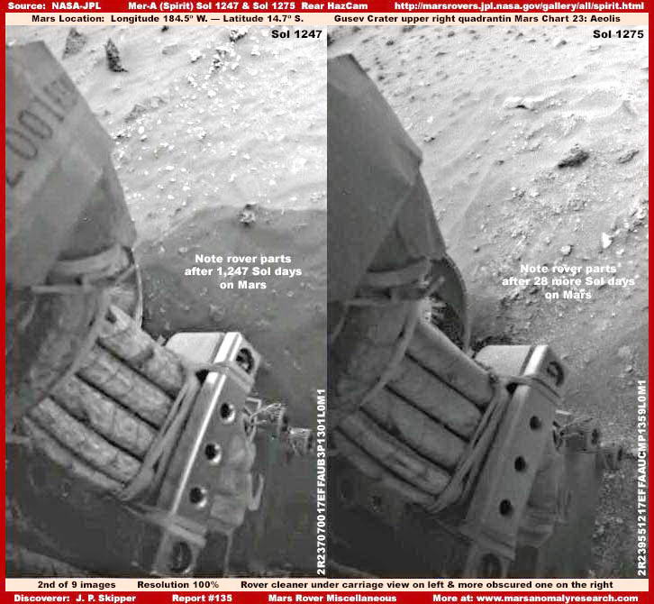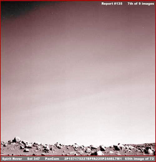 Ahogy az rögtön észrevehető, bal oldalt felül, a Spirit marsjáró által, Sol-1304-kor a hátsó kamerája által készített, fenti első felvételen, egy méretes, szokatlan objektum emelkedik a levegőbe, alig valamivel a felszín felett jár, és nem lehet túlságosan messze a robotberendezéstől sem. Figyeljük meg közel gömb alakját, emellett az objektum kellően szilárd ahhoz, hogy a ráeső fény többségét elnyelje, nem láthatunk visszaverődést, ugyanakkor furcsán diffúz jellegű is. A képen látható alakzatra a Skipper figyelmét Anthony R. hívta fel, New Havenből, egyben kérdezte véleményét, mi is lehet valójában. Mielőtt elemeznénk ezt a gyanús dolgot, előre kell bocsátani, semmiféle valós marsi objektumról nincs szó. Nagy valószínűséggel maszat vagy paca a kamera lencséjén, de ez még nem az egész történet. Mindösszesen néhány marsi nappal korábban mutatkozott ez a jelenség először, mint amikor ez a bizonyos Sol-1304 fotó készült. Előtte soha sem látszott, de ezután viszont valamennyi felvételen látható a baloldali hátsó kamera képein, miközben a jobb oldali lencse képein nem mutatkozik, amikor a két képet egymás mellett láthatjuk. Azért illesztettük ide a fotót, mert felkelti figyelmünket ha rápillantunk, és lehetnek olyanok, akik valamilyen valós marsi objektumnak vélik. Nos, nem az, nem valóságos, de a kérdés jogos, miért jelenik meg hirtelen ez a valami, amikor korábban nem létezett? Ezt a kérdést talán megválaszolhatjuk a következő kép segítségével.