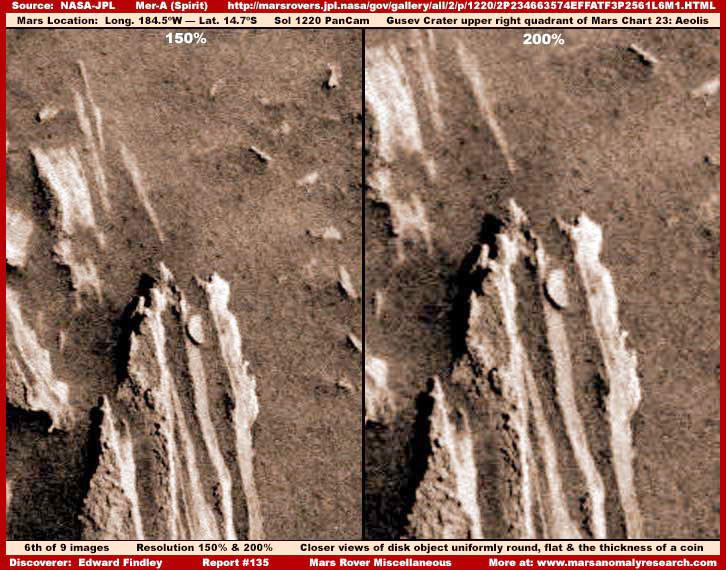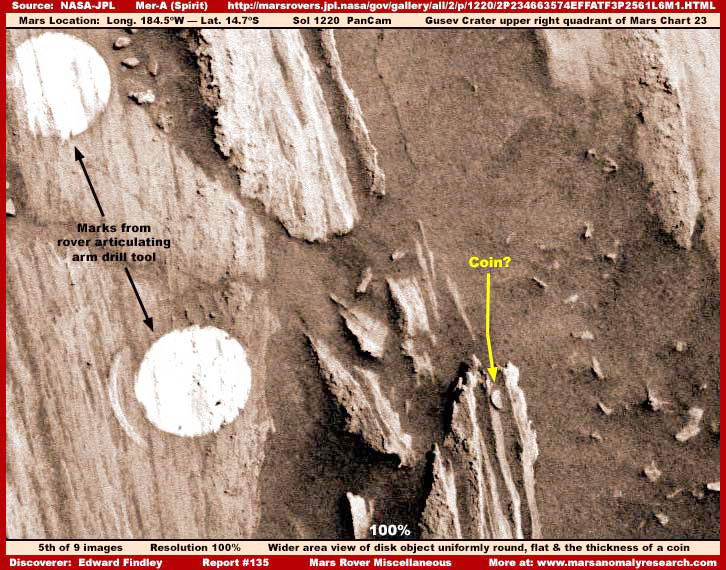 A fenti ötödik és hatodik felvételen kis, kerek, lapos korong látható a földön, sárga nyíl jelzi, teljesen véletlenül kerülhetett a marsjáró lencséje elé, miközben az saját fúróberendezése tevékenységének eredményét fotózta a célba vett sziklákon. Egyik sziklarepedésbe szorult be, melyet szemmel láthatóan talaj tölt ki. Ha valóban talaj és nem pedig a látványt megtévesztő képhamisítási beavatkozás, ez esetben a talaj a korongnak nagyjából a felét takarja szem elöl. Figyeljük meg, a korong felszíne visszaveri a napfényt, kissé erőteljesebben a környező szikláknál, felszíne pedig sokkal egységesebb. Mindez arra utal, hogy ez a tárgy nagy valószínűséggel sima felületű fémdarab. Ugyancsak figyeljük meg az egységes vastagságát, jól látható a bal oldali, kiemelkedő részén, valamint a sziklára vetett keskeny árnyékán. Nos, ez a korong egyértelműen úgy néz ki, mint egy fém érme, és pontosan olybá fest, ahogy az tőle a legtöbbünk által elvárható. Azonban az érme pontos felszíni részleteinek hiányában nem hozhatunk egyértelmű következtetést, habár nagyon könnyű lenne. A kétséges helyzet a nagyarányú jpeg tömörítés miatt áll elő részben, ez a szokásos megoldás a nyilvánosságra számára szánt felvételek feldolgozása esetén. Ez a tárgy meglehetősen közel van a Spirit marsjáró kamerájához, az apró részletek tehát műszer számára nyilvánvalóan elérhetőek, tökéletes minőségben, csak ugye ezeket a képeket már nem nekünk szánják. Annak idején, a NASA és a JPL felkészítette a nagyközönséget, szuper felbontású képek készítése várható majd a marsjáróktól. Ebben lehetett némi hencegés is, az akkori idők digitális berendezéseit figyelembe véve. Tegyük fel, tényleg csak hencegtek, amikor hihetetlen finomságú felvételekről beszéltek, ám, ha figyelembe vesszük a tudományos adatokban a tömörítési rátákat, már kevésbé tűnnek az eredeti kijelentések hencegésnek, csakhogy azokat a bizonyos csúcsminőségű felvételeket nem a mi számunkra tartogatják. A marsjárók kameráihoz ekkora közelségben teljesen nyilvánvaló, hogy látnunk kellene az érme felszíni részleteit, és jócskán nagyítani is lehetne a képet, legalább olyan mértékben, hogy el lehetne dönteni róla, hogy valójában egy érme-e vagy sem. Amennyiben ez a felvétel a Földön készült volna, mondjuk egy 3-5 megapixeles fényképezőgéppel, s még esetleg erős jpg tömörítésnek is vetettük volna alá az elkészült fotót, ennél a minőségnél akkor is messze jobb eredményt kapnánk. Itt azonban a művészien kidolgozott tudományos kamera és a maga szuper felbontása sokszorosan marad el a mi hétköznapi fényképezőgépünk mögött, ennyi erővel már egy olyant is küldhettek volna a dollár milliárdokat fizető adózók pénzén, hogy legalább azt a minőséget visszakapjuk… Sajnos, nem tudjuk tehát tisztán kivenni a korong valódi természetét. Sőt, úgy gondoljuk, még ez a lenyomorított felbontású felvétel is nagyon sokak csőrét bántja. Ebbe könnyű beleőrülni. Különösen azok számára bosszantó, akik az érdeklődők szeme elé kívánják tárni a valós információkat, s lehetőleg minél jobb minőségben. Viszont ami kifejezetten felháborító, hogy az egész világ magasan képzett akadémikusai, tudósai, mérnökei, grafikusai, szakemberei, és azok akik érdeklődnek a fotográfia iránt, egyszerűen vakká válnak, az ennyire nyilvánvaló dolgok iránt. Hogyan képes az a több millió ember arra, hogy miközben a saját fényképezőgépükkel készült fotókat láthatja nap mint nap, vagy a földi műholdas fotókat, a maguk egészen elképesztően lenyűgöző minőségű látványát, ugyanezek az emberek elvesztik látásukat, amikor marsi fotókat vesznek kezükbe? Ez teljességgel lehetetlen, értelmes magyarázatot nehéz rá találni, ha egyáltalán van, de nemcsak bosszantó e tény, hanem mélyen lesújtó is. Így bánnak velünk, mert hagyjuk, hogy ezt tegyék. Megengedvén számukra a felénk irányuló ilyetén bánásmódot, a fejükben ez koncepciózussá válik, s másoknak is útmutatást ad, hogy kövessék példájukat, a saját igényeiknek megfelelően, s persze a mi kárunkra. Nos, éppen ez a megoldás! Ezzel a felfogással élve, megtagadván bármi megkérdőjelezését, ugye nem igényel semmiféle gondolkodást, és ezáltal ugye nem is zavarnak semmiféle, nehezen megemészthető dologgal, tehát problémák sem adódnak. Ha valaki lehajtja a gallérját miközben zuhog az eső, csak azért, mert mások azt mondják, hogy szép idő van, hát ne csodálkozzon, ha bőrig ázik. Azt kapja, amit megérdemelt. De ne is bosszankodjunk tovább, inkább lépjünk a következő felvételre.