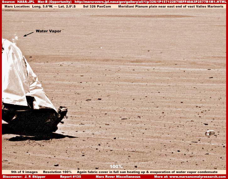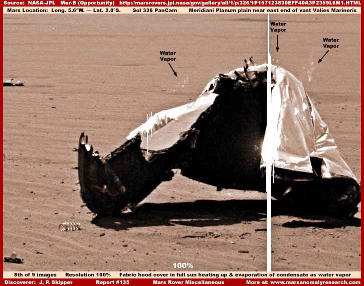 A fenti, nyolcadik és kilencedik felvételt az Opportunity marsjáró készítette, a földi látogató egyik berendezése hever a Mars talaján. Természetesen szemünk hajlandó csakis és kizárólag a szerkezetre magára koncentrálni, és pontosan ez is volt a célja a marsjáró által elkészített fotóknak, a drámai hatás érzékeltetése. Azonban más is van ezeken a felvételeken, s ezek igencsak figyelemre méltó, s ezúttal nem a lábunk előtt heverő forrásra gondoltunk. Figyeljük meg mindkét képen a felszálló pára gomolyagjait – nyilak mutatnak rájuk. Közvetlen alattuk megláthatjuk árnyékukat is, ha jobban megnézzük. Ebből kifolyólag a Nap függőlegesen lefelé süt, közvetlen a fejünk felett van, azaz a nap legmelegebb időszakában járunk, az időpont pedig Sol 326, ekkor készültek a fényképek. Ne felejtkezzünk el arról, hogy ez a védőburok már 326 napja pihen a mars felszínén, felmelegszik majd kihűl újra, a nappalok és éjszakák változásainak következtében. Ez meglehetősen hosszú idő. Valójában túlságosan hosszú ahhoz, hogy bármi a védőburok alatt a melegedés hatására füstfejlődéssel válaszoljon – ennyi idő után. Számos felvételen bukkannak fel ezek a páragomolyagok, felfelé szállnak, csak a jelenség bemutatása végett választottuk éppen ezt a kettőt. Olyan ritka légköri viszonyok mellett, amilyen a Marson uralkodik, és a felvétel által sugárzott sivár helyen ugye azt várnánk el, hogy éjjel igen mélyre süllyed a hőmérséklet, s természetesen ezzel párhuzamosan a szilárd testek is jelentősen lehűlnek, a hűlési szakasz pedig igen gyorsan zajlik le, leginkább ugye a kora esti órákban. Azaz, ahogy az este közeledik, hőmérsékleti különbség lép fel a környezeténél melegebb szilárd tárgyak és a légkör között, a hőmérséklet csökkenésével pedig teljesen jogosan várhatjuk el a melegebb objektumokról pára felemelkedését a légkörbe. Pontosan így, amikor elérkezik a reggel, a Nap elkezdi felmelegíteni a légkört, a tárgyak eközben hidegebbek maradnak egy ideig, ezért a hőmérsékleti különbség miatt harmat kiválására számíthatunk a felszínükön. Láthatjuk, ez a berendezés üreges, és nyitott, hiszen feladata a védőburkolatként való szolgálat. A légköri pára (emlékezzünk vissza a 7. Felvételen látható felhőkre) könnyedén bejuthat a belső területekre, a kupola-forma alá. A nap közepe felé, amikor legmelegebb van, s a szóban forgó tárgy is felmelegszik, szilárd objektumokhoz méltóan, igen valószínű, hogy a Nap felé mutató felszínéről némi pára felszabadulás bekövetkezik, hasonlóképpen, a kupola-forma alatt csapdába esett harmat ugyancsak gőzzé válhat, s a réseken át utat törhet a magasba, pontosan ahogy a fenti felvételen látható. Hiba volt nem elrejteni ezt a jelenséget, hiszen könnyen magához vonzza az ember tekintetét, ha pedig már magára vonzotta, akkor bizony a figyelmét is felkelti egyúttal. A képhamisítási beavatkozásokat azonban automatikus számítógépes programok végzik, elképzelhetetlenül gyors számítógépeken, a bejövő képek száma pedig igen tekintélyes, s csak olyan mértékben képesek megbírkózni velük, amilyen mértékben jó maga a program. Általában minden nagyszerűen működik, ám túl sok a lehetőség, az egész világ minden egyes eshetőségét nem képes a program kezelni. Tehát könnyen és logikusan megérthető, a vízpára gomolyagok nem tartoznak a számítógépes program figyelmét felkeltő elemek közé. Végszóként elmondhatjuk, hogy ha a légköri pára képes kiválni egy berendezés egyik alkatrészének szilárd felületére, akkor ugye a Marson található, természetes geológiai összetevőkre is készségesen kicsapódik, amennyiben a feltételek erre adottak. Máris eljutottunk egy olyan élet alapjaihoz, mely ezen a párolgási cikluson alapszik, kihasználva annak minden előnyét, létezése pedig cáfolhatatlan. Az erre való bizonyítékot láthatjuk a kicsiny gőzpamacsokban, valamint a marsi fellegekben az égen. Kőkemény bizonyíték, s egyben kulcs! Mondhatja valaki ezek után, hogy nem létezhet élet a Marson? Ugyanígy, most már jobban megérthető miként működik a hamisítási ipar, például a mellékelt első és második felvételen, s az is, ez a hamisítási technika miért és mi módon korlátozott. A légkörből kicsapódó és elpárolgó pára körfolyamata képes kisebb méretű, a marsi sziklákhoz és talajhoz kötődő életfolyamatok kiszolgálására, mint amilyenek például a sziklákon élő zuzmók, ezekről már esett szó korábban a „Kőhalmok a Marson - vagy valami más?” és a „Marsi élet talajszinten” – című írásokban. A sziklákon és a sziklás területeken élő gombák igen halványan láthatóak csak, sajnos a hamisítási technika szinte tökéletesen működik esetükben, rendkívül nehéz észrevenni ezeket a kisebb élőlényeket, ráadásul azon a léptéken, amelyet a felbontás szándékos lerontása miatt már eleve meg sem láthatunk a legtöbb esetben. Igyekeznek beelőzni bennünket. Amikor azonban durvább felületű sziklát veszünk észre, máris elkezdhetünk gyanakodni, s a szikla nagyméretű karakterisztikájából kikövetkeztethetjük egyes esetekben, hogy azt bizony nem csak geológiai erők formálták, a közvetlen megfigyelése a kicsiny élőlényeknek általában lehetetlen.