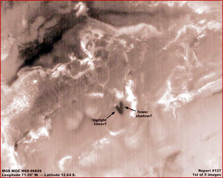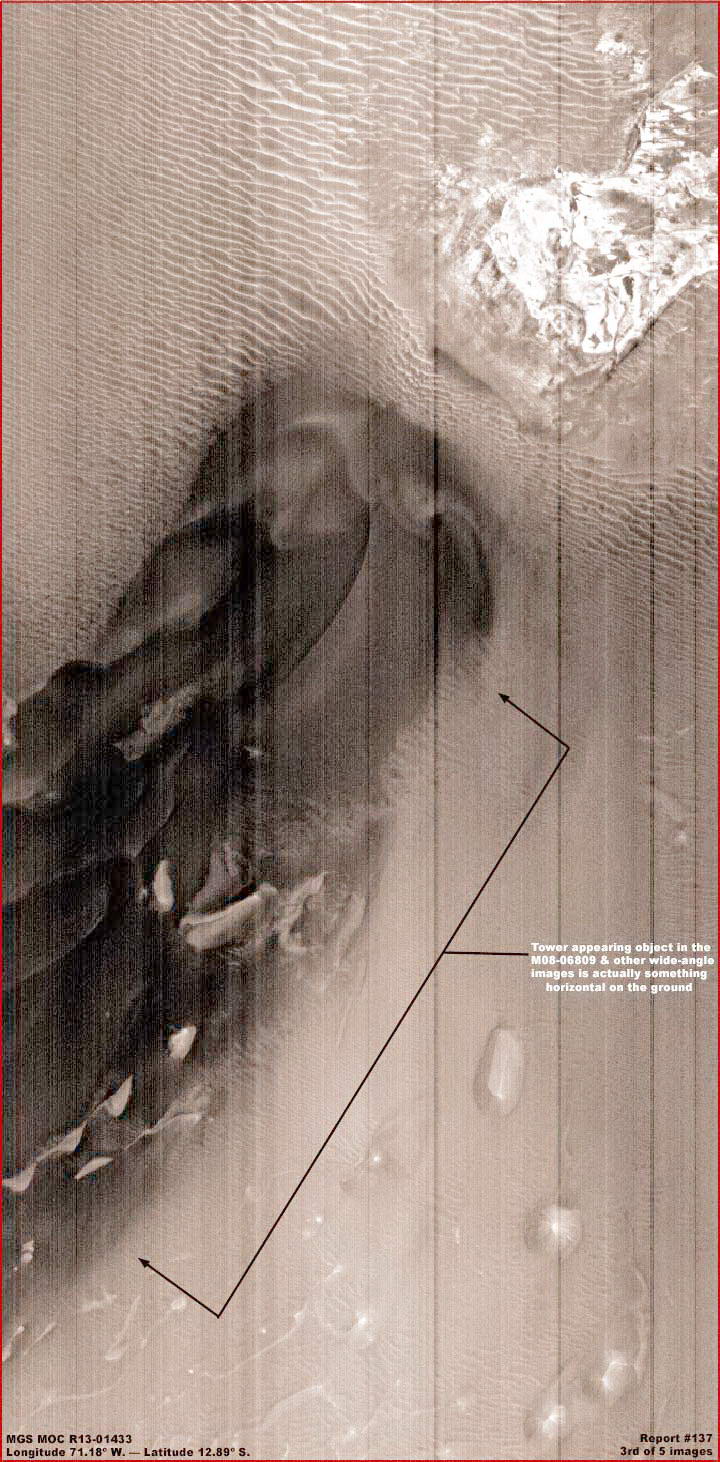 A fenti, első felvételen, nyilakkal és feliratokkal jelezzük az igen nyilvánvalót, valamiféle sötét torony látható a Marson, teteje igen erősen visszaveri a fényt, a felszínre sötét árnyékot vet, tőle jobbra és felfelé. Figyeljük meg, az árnyék hossza és szélessége milyen pontosan illeszkedik a torony formájához, s annak pontosan a tövétől indul ki. Fontos tudni, hogy ez a forma az egyik széles látószögű felvételen látható, nevezetesen az MGS MOC M08-09809 katalógusszámú fotócsíkon, jelen esetben tehát nem a keskeny látószögű fotócsíkról van szó. Továbbá, Skipper elfordította függőleges irányban, hogy jobban megfigyelhető lehessen, ne zavarja semmi össze a látványt. Fontos tisztában lenni a széles- kontra keskeny látószögű felvételek mikéntjével, ez utóbbiak közelebbi látványt nyújtanak, míg az előzőek távoli, átfogó képet, nyilván, messze rosszabb felbontásban. Ez azt jelenti, hogy a széles látószögű felvételeken megjelenő objektumoknak valójában hatalmasnak kell lenniük és kiterjedteknek. Áttéve jelen esetre, ez a torony-jellegű objektum bizony igen hatalmas, egyébként észre sem vehetnénk. Másrészről, a vizsgálata ezen, a széles látószögű, ám igen rossz felbontású felvételen nem igazán vezet eredményre, igen kicsi az esélye további részletek felfedezésének.