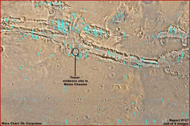 A fenti, második felvétel az MGS 18. Marstérképe, megcímkézve láthatjuk azt a helyet, ahol a torony található a Melas Chasma térségében. Könnyű észrevenni, ez a terület nagyjából a közepén és az alján található a nevezetes és hatalmas Valles Marineris marsi kanyonrendszernek, az ismert legmélyebb ilyen geológiai alakzatnak, s a Melas Chasma még ezen belül is a legmélyebb részt képviseli. Mindez tehát azt jelenti, hogy ez az objektum messze a normális, a helyszínt övező talajszint alatt található, nagyjából 11 km-es mélységben. Remélhetőleg nem lesz túlságosan kiábrándító, már előre el kell mondani, hogy a toronynak látszó objektum nem más, mint érzékcsalódás, azaz nem valós. Az egyik ok, hogy hajszálpontosan ugyanúgy néz ki valamennyi MGS MOC fotócsíkon, ezen belül is csak a széles látószögű felvételeken, a keskeny látószögűeken ugyanis nem látható. Egyetlen egyen sem. (Mondjuk, ezt akár be lehetne tudni a más működési jellegű képhamisító számítógépes programoknak is.) A felvételek tehát: