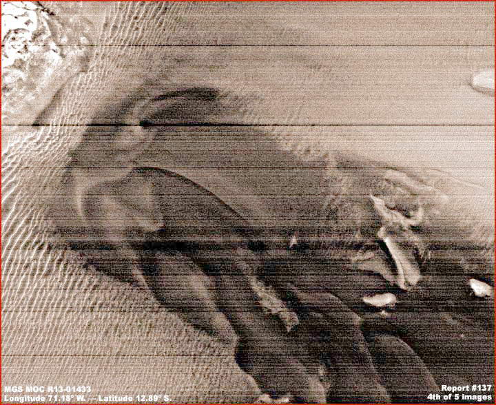A fenti, negyedik felvétel ugyanazt az objektumot ábrázolja, ám 90 fokkal elforgatva az óramutató járása szerint, emiatt kicsit más a perspektíva. Ez a látvány már sokkal természetesebb fényben tünteti fel az objektumot, és geológiai megjelenésűnek, azonban Skipper meggyőződése szerint itt valami ismeretlen életformát látunk valójában. Ez az objektum már a széles látószögű felvételen is hatalmasnak mutatkozik, ám az első képen látható mérete csak közepesnek tekinthető a többi, olykor sokkal kiterjedtebb objektumhoz képest, ráadásul kissé feltöredezett, a sokkal egységesebb képet mutató társaihoz képest, melyek többnyire jóval nyíltabb területeken helyezkednek el, következésképpen, kedvelik a napfényt. Ez azonban, és hozzá hasonlatosan mások is, bizonyára csapdába estek a Melas Chasma mélységeiben. Figyeljük meg a nagyszámú, kisebb és nagyobb, párhuzamos gerincformát amint körbeveszik ezt az objektumot. Általában a lejtők lejtési iránya felé irányítottak. Figyeljük meg a nagyobb, több részletet mutató példányaikat az objektum balján, szemben a jobb oldalt találhatókkal. Ez azt jelenti, hogy a látvány jelen esetben pontosabb, egyúttal azt is megállapíthatjuk, hogy ez a hatalmas objektum merőlegesen helyezkedik el a lejtő irányára, blokkolja a szabad lefolyást. Ahol a víz sokkal szabadabbal tud alá folydogálni, az objektum bal oldalán a gerincformákon át, azok ott sokkal tisztább formát öltenek, jobban láthatók és nagyobbak. Ahol azonban a vízfolyás blokkolva van, megszakad a lejtő, és bizonyára részben elnyeli a vizet az kiterjedt objektum, a jobb oldalán már korántsem ilyen szépen fejlettek e formák. A lejtő hajlásszöge is valószínűleg enyhébb ezen a részen. Skipper gyanúja szerint a sötét színű objektum valamiféle ismeretlen telepes jellegű életforma, mely befedte a mélység egyik pontját, ezen a helyen, innen a feltöredezett külső, ám jól láthatók a vetődések hullámai, hiszen az eredeti felszín megtalálható eme élő takaró alatt. Akárhogy is, függetlenül attól, ki mennyit fogad el a fenti elméletből, a végszó az, hogy ez a bizonyos, toronynak látszó objektum, a maga árnyékával, és tényleg úgy néz ki, mintha valóban egy tornyot látnánk, azonban mindez csak érzékcsalódás a széles látószögű felvételeken. A fentiek természetesen nem hangzanak kellemesen azok számára, akik erről az objektumról, mint toronyról számoltak be. Ez egyike a korai felfedezéseknek, melyekkel Skipper találkozott, miután elkezdte az MGS MOC felvételeket elemezni 200-ben, ám nem az övé, másvalakié. Évekig nem számolt be róla, mert nem szeretett volna mások lábujjára lépni, akik támogatták a torony elméletet. Már akkor is tudta, nem toronyról van szó, de azt már nem, hogy mi lehet valójában, így inkább csendben maradt. Ám az évek során újra és újra beleütközött ebbe az objektumba, ismételten felkeltette a figyelmét, a hozzáfűzött magyarázatok számos ember lelkesedését felkeltették. Így hát elhatározta, lép ebben az ügyben és elkészíti ezt a beszámolót abban a reményben, hogy az elkövetkezendő magyarázók már figyelembe vegyék és neki se kelljen később. Másrészről viszont, a sorban az ötödik és egyben utolsó felvétel bizonyítja, hogy az R13-01433 jelű, keskeny látószögű felvétel, melynek egyébként láttuk részleteit a sorban a 3. és 4. felvételen, jóval több látnivalót kínál, mint a hatalmas, megmagyarázhatatlan sötét objektum.