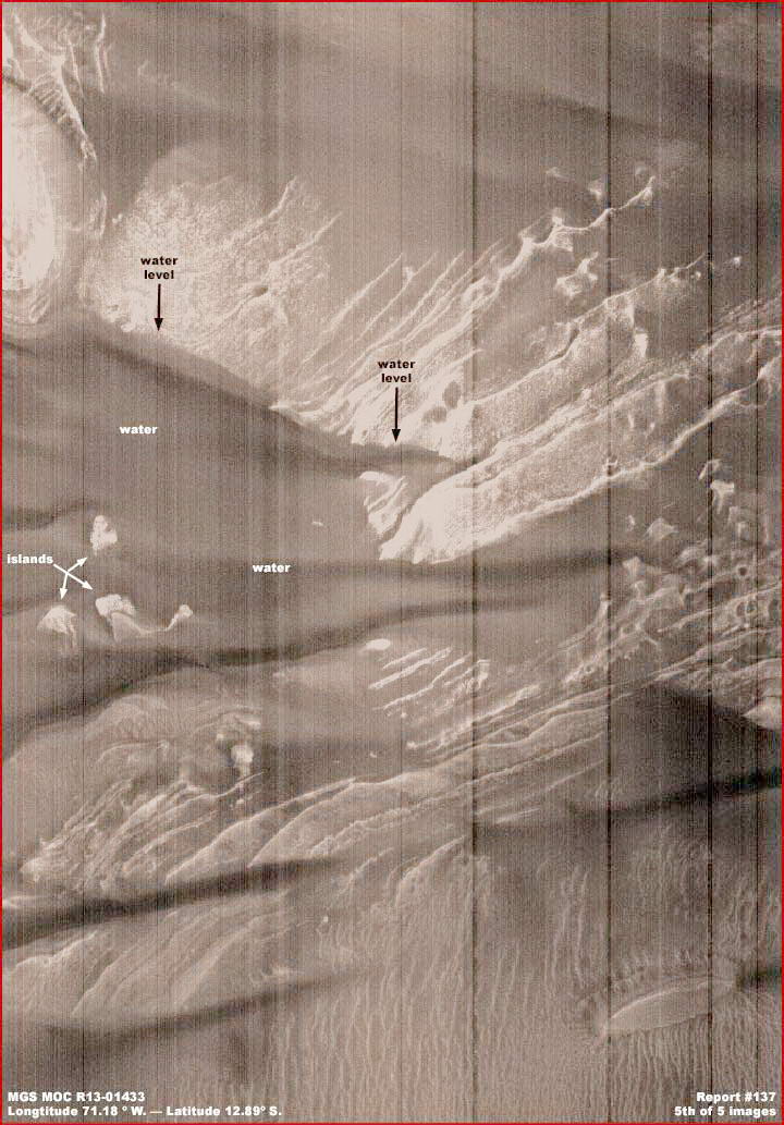 A fenti, ötödik fotó bizonyíték egy meglehetősen könnyen beazonosítható vízzel fedett területre, ugyanezen a bizonyos R13-01433 jelű felvételen. Igaz, nem a legegyszerűbben felismerhető, s normális esetben nem is vesz bele ilyen jellegű fotókat a beszámolóiba Skipper, éppen ezért. Az esetek többségében egyszerűen átlép az ilyen minőségű képeken, most azonban mégis kivételt tesz abban a reményben, hogy a legtöbben mégis képesek felismerni. A probléma abból adódik e helyszínen, hogy a víz egységesen sekély. Tiszta és nem rendelkezik felszínén tükröző képességgel. Emiatt a felszín alatti formák tökéletesen látszanak, mintha üvegen át néznénk őket, sőt, jobban megfigyelhetők, mint az őket ellepő vízréteg maga. Igazából, ha nem látszana egyértelműen a vízből kiemelkedő területen a partvonal, a fekete nyilakkal és feliratokkal jelzett részen, valamint a vízből kiemelkedő kis szigetek, akkor egyáltalán nem is esett volna erről a helyről szó, mert számos megfigyelő számára tényleg nehézségekbe ütközött volna a felismerés. Skipper gyakran tesz így ilyen esetekben. Hosszú évek tapasztalata során arra a következtetésre jutott, hogy a nagy területet elfedő párhuzamos gerincformák minden esetben sekély víz jelenlétét jelzik, akár látható az, akár nem; a gerincformák irányultsága pedig egyben a lejtő irányát is mutatja. Minél határozottabb és szabályosabb megjelenésük, annál tartósabb az őket létrehozó feltételrendszer, annál szabályosabb maga a lejtő is, hasonlóképpen, ha a irányultságuk felbomlik, miként az a fenti, ötödik kép jobb alsó részén látható, akkor ebből következtethetünk rá, maga a lejtő sem szabályos. Nem érzik jól magukat és fejlődésük gátlást szenved, amennyibe a felszín túl síkká válik és a víz mélyebb lesz. Akárhogy is, a gerincformák puszta jelenléte arra utal, kezdjünk el vizet keresni, és reménykedjünk benne, hogy valamennyi hamisítási technika alkalmazása ellenére nem tették teljesen tönkre a felvételt és megtalálhatjuk. Jogosan várhatjuk el, hogy a vízlelőhelyek tartalma idővel elszivárog a mélyebben fekvő törésrendszerekbe és ott felszívódik időről-időre; emellett pedig azt is, hogy a képhamisítási technikák fejlődnek (már ha egyáltalán elfogadja a Kedves Olvasó a létezésükt…), ezek a beavatkozások további nehézséget jelentenek, különösen a Valles Marineris rendszer mélységei esetében készült képek kapcsán, ahol ezek a ténykedések bizony kifejezetten hatékonyak. Továbbá, ezen mélységek mellett, távolabb a kamerától, számos kaotikus régió található, egészen egyedülálló szögek megjelenése mellett, további nehezítést adva a helyszín értelmezésének. Ezért ezekben a mélységekben található formák még tömörítettebben jelentkeznek a fotókon, az átlagos felszínhez lévőkhöz képest, ezért beazonosításuk további nehézséggel jár. Amikor először bukkant Skipper erre az R13-01433 jelű fotóra az MSSS archívumában, még elérhető volt mind a jpg, mind a gif formátum a keresőprogramok számára. Ezután megkereste az imq kiterjesztésű tudományos adatcsíkot és saját maga is konvertálta a NASA által felkínált program segítségével gif kiterjesztésűre. És némi Photoshopos alkalmazást is végrehajtott. Ezeket az feldolgozott képeket lehet látni a beszámoló 3.-5. Felvételei kapcsán. Igyekezett tehát a képeken található maximális mennyiségű információt itt átadni. Azóta a jpeg felvétel továbbra is elérhető. Hozzáférhető az USGS oldalon is, és néhány szempontból az némileg jobb. Habár ezek a felvételek jobb minőségűeknek tűnnek miközben a felszíni alakzatokat vizsgáljuk, azonnal súlyos minőségromlást szenvednek el, mihelyt a legkisebb mértékben is nagyítani próbáljuk. Már közel sem adják azt a minőséget, melyeket az itt bemutatottak még képesek nyújtani, habár ezek sem tökéletesek, tele vannak csíkokkal. Ha valaki megnézi az imq felvételt, meglehetősen sötétnek találja majd, túlságosan is, már-már a felismerhetőség határán van. Mindenképpen tisztítani kell tehát, hogy elfogadható minőségben lehessen szemlélni, miként azt itt tettük.