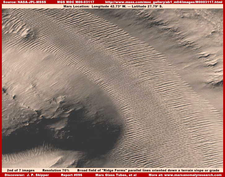Nemrégiben Skipper kapott néhány e-mailt, hangsúlyt adva annak a felvetésnek, mintha egyetértene a marsi „üvegalagutak” létezésével, ez az álláspont meglehetősen zavaró lehet, különösen a réges-régen írt első beszámolója, „Az igazi füstölgő fegyver: élet van a Marson” – című írás fényében Nos, szeretné véleményét egyértelművé tenni ebben a kérdésben és bemutatni néhány, ezekhez az alakzatokhoz kapcsolódó formát. Még 2000-ben, a legelső MGS MOC tudományos adatokat szándékosan tartották vissza a nagyközönség elöl, Skippernek viszont elévülhetetlen érdemei vannak, sikeresen gyakorolt nyomást egyes kongresszusi vezető képviselőkre, akik hangot adtak elégedetlenségüknek. Amikor az adatokat végül is elkezdték nyilvánosságra hozni, Skipper rábukkant a fenti első, M04-00291 jelű felvételre, néhány sokkal rosszabb minőségű kép társaságában Richard Hoagland honlapján, ahol – Skipper álláspontja szerint – nem tudtak semmit kezdeni vele. Akkoriban, kezdőként és naivként Skipper semmiféle hatást nem tudott elérni felismerésével sem a honlapjukon, sem a médiánál. Végül elege lett ebből és nyilvánosság elé lépett a dologgal, nyomást gyakorolt a médiára, amíg végül is vevők lettek rá. Hoagland és társasága észrevette mi történik, s abban a pillanatban lecsaptak erre az esetre, s villámgyorsan gyönyörű internetes környezetet varázsoltak köré a honlajukon, azonban továbbra is annak a véleménynek adván hangot, hogy valamiféle üvegalagutakról van szó. Akkoriban még Skipper nem rendelkezett grafikus számítógépes programismerettel, megbízott a képek valódiságában, s mások képfeldolgozási adatainak hitelességében, beleértve Hoaglandot és csapatát is. Naivitása tehát hiszékennyé tette, kezdeti média-szereplései a félrevezetettség állapotában történtek, alapjaiban megbízott a nála sokkal nagyobb tapasztalatokkal rendelkezők gyakorlati tudásában és következtetéseiben, ezek a hatások jellemzik korai beszámolóit tehát. Azonban, a kezdeti lökést követően, egyes dolgok nyilvánosságra hozatala után, a nyilvánosság részéről továbbra is érkeztek felé a kérdések, ezeket viszont nem tudta megválaszolni alaposabb vizsgálatok elvégzése és mélyebb tapasztalatok gyűjtése nélkül, s egyben arra is rá kellett döbbennie, hogy nem szabad másokban bíznia. Kis idővel később tehát beszerezte a saját Photoshop programcsomagját, és elkezdte megvizsgálni a marsi alakzatokat sokkal alaposabban, beleértve az „üvegalagutak” estét is. Amit legelőször észrevett az volt, hogy ezek az alakzatok távolról sem üvegcsatornák és semmiféle ilyesmik. Ebben teljesen bizonyos lett, és a következő években ettől kezdődően átvizsgált több tízezernyi fotó csak további megerősítésképpen szolgált, miszerint a képen látható formák a felszínen vannak, s valamiféle életet képviselnek. A felszíni lejtőket beborító és azokon burjánzó életet, a lankákon aláfolyó sekély víz jelenléte mellett, mely aztán végül összegyűlik a lejtők alján. A lejtő alján aztán a gerincformák hirtelen véget érnek, a mélyebb vízben már nem érzik otthonosan magukat, csak a sekély vízfolyások jelentette körülmények közepette, ilyen háttér mellett épülnek fel a párhuzamos gerinc alakzatok. Az egyetlen kivételt az jelenti, amikor a víz időszakosan megemelkedik, s beborítja a gerincformák egy részét. Amikor az egy-egy mélyedés felé tartó lejtők viszonylag rövidek, a felső részüktől az aljukig terjedően, a vízfolyás térsége pedig keskeny és elnyúlt, abban az esetben ezek a bizonyos párhuzamos irányítottságú „gerincformák” ugyancsak elnyúltak és keskenyek lesznek, megjelenésükben sokkal egységesebbek, az őket egymástól elválasztó térköz egyforma. Amikor egy alakzat ezt a bizonyos megjelenést mutatja, mint például a fenti, első képen, könnyen eszébe juthat bárkinek is a „alagút” (vezeték) elmélet, a megjelenés ugyanis hasonló egy hosszú vezetékhez, s a gyenge műholdas képfelbontás mellett, amit számunkra elérhetővé tesznek, könnyű megvezetődni. A maszatolásos képhamisítási technika tipikusnak mondható ilyen jellegű formák esetében, ugyancsak feltűnik a fenti, első képen, s már eleve megerősíteni tűnik a fenti felvetést, megsemmisítve és elsimítva a gerincformák közvetlen környezetének megfigyelhetőségét, így erős kontraszthatás jelentkezik, a gerincformák még inkább kiemelkednek az elmaszatolt háttérből, és még hangsúlyosabb alakzatokként jelentkeznek. Amint Skipper felismerte, mi folyik az ilyen alakzatokkal kapcsolatosan a háttérben, azonnal visszavonta álláspontját az „üvegcsatornák” vonatkozásában, s megváltoztatta az eredeti, „Az igazi füstölgő fegyver: élet van a Marson” – című beszámolóban foglaltakat, ezután számos követő alkalommal utal saját álláspontjára, növekvő tapasztalat-mennyiségére, kialakítván saját elképzelését, sokkal inkább, mint mások véleménye felé hajolva. Azonban, mindezek után, még mindig vannak a világban néhányan, akik szerint üvegalagutakat látunk, esetleg összekevervén Skippert Hoaglanddel és társaságával, és korábbi munkáját alapul véve, ám figyelembe kell venni, hogy az első beszámolót követően megjelent az „Alagutak: természetes geológiai formák, vagy élet?” című tanulmány, 2001.03.29-én, megpróbálva egyértelművé tenni Skipper álláspontját a kérdésben, és mélyebb bepillantást adni a jelenségre. Most, ebben a beszámolóban újra megkísérli összefoglalni a legfontosabb dolgokat a szenzációként tálalt, vagy olykor marsi férgeknek tartott „üvegalagutakról”, s egyben nyomatékosítani, a megnevezett értelmezések nem köthetők 