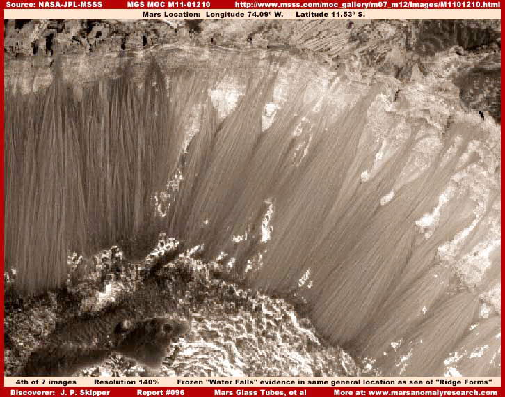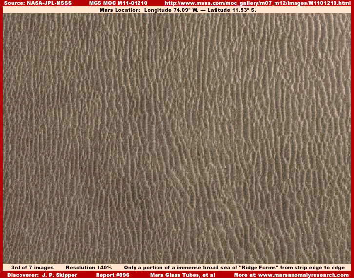 Az esetek egy részében, s éppen erre ad példát a fenti, M11-01210 jelű, újabb fotócsík, a sorban a harmadik, a gerincformák igen tekintélyes méretűvé növekedhetnek, elfedvén mindent, mely a természetes topográfiához tartozott. Figyeljük meg a sötétebb, a fényt jobban elnyelő színárnyalatot és a fényvisszaverő-képesség hiányát. Igen erőteljes világosítást kellett alkalmazni a felvételen, hogy egyáltalán látható lehessen, mit is ábrázol. Az általános sötét tónus abból adódik, hogy minden egyes keskeny vonal teteje erősebben veri vissza a fényt, viszont nagyon keskeny, ezért árnyékot vet, s emiatt a gerincformák közötti rész sötétbe burkolódzik, a hatás pedig összeadódik a sok-sok jelen lévő nagyjából azonos magasságú forma miatt, az általános hatás tehát sötétebbnek mutatja ezt a térséget, mint esetleg valójában lenne, az árnyékhatás elnyomja a gerincek tetejének erősebb fényvisszaverő-képességét. A helyszín általános látványa olybá fest, mintha hullámverte tengerpartot látnánk, ez egyben arra is utal, hogy a formák kialakulásához vezető vízmennyiség hosszú időn át volt jelen a térségben, kellően elegendő ideig ahhoz, hogy ez az igen kiterjedt térség jelenleg megfigyelhető formájában létre jöjjön. A látvány itt igen távoli, ezért teljességgel lehetetlen bármilyen, normális méretű szokatlan formát észlelni, melyek bizonyára jelen vannak a gerincformák között, hiszen egyébként vajon miért hamisították volna olyan lelkesen a gerincek közötti mélyedéseket? Ezek a beavatkozások kissé más általános fényben tüntetik fel a megelőző két képen látható formákat, de lényegében pontosan ugyanazokról a képződményekről van szó. A szóban forgó alakzatok a Coprates Chasma térségében találhatók, e hihetetlen méretű és mélységű kanyon- vagy törésrendszer területén. Teljesen logikus, hogy elvárjuk a nagyon hosszú és többszintű lejtős vidékek kialakulását, mint általános jellemvonását, ennek a gigászi rendszernek. Hasonlóképpen, egyáltalán nem meglepő, ha a felszín alatti talajvíz kibukkan és a Chasma környező, mélyebb vidékei felé áramlik.