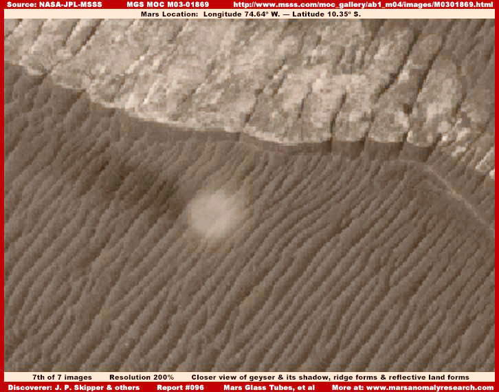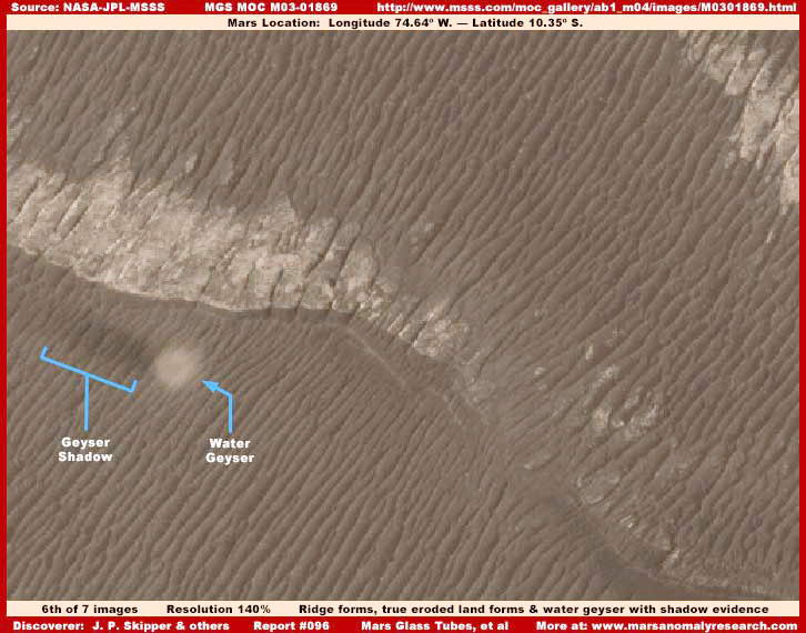 A fenti, hatodik felvétel a megelőző, M03-01869 jelű fotócsíkról való ugyancsak, ám a korábbi helyszíntől kissé lejjebb. Valójában Skipper egyik első, vízzel kapcsolatos felfedezései közül való, néhány nappal azután talált rá, amikor végre elkezdték nyilvánosságra hozni az MGS MOC tudományos adatait. Sokáig visszatartotta, abban a reményben, hogy majd csak a könyvében teszi közzé, ám időközben mások is rátaláltak, ezért nem volt érdemes túl sokáig ülni rajta. Visszaemlékezései szerint mindössze néhányan ismerték fel vízkitörésként, a többség elfogadta a hivatalos „porördög” elképzelést. A hivatalos magyarázat minden esetben porördögökről és dűnékről szól, hiszen igyekeznek folyamatosan fenntartani a félrevezetést, miszerint a Mars száraz és poros vidék, lehetetlen rajta az élet. Még ha igaz is lenne, hogy a Mars nem tartalmaz a felszínén nagy mennyiségű vizet, miként a Föld, utóbbi ugyanis elsősorban vizes bolygó, valahol azért mégis ironikus az a helyzet, miszerint a hivatalos állásponttal ellentétben, a Mars komoly mennyiségű vizet tartalmaz. A hatalmas gejzír-kitörésre kék nyíl mutat, és felirat is jelzi a fenti, a hatodik felvételen, egyben jó bizonyítékként szolgálva az állítás mellett. Ugyancsak érdemes átgondolni a gerincformákra vonatkozó elképzelést a fentiek alapján, hiszen lényegében vízről van szó.