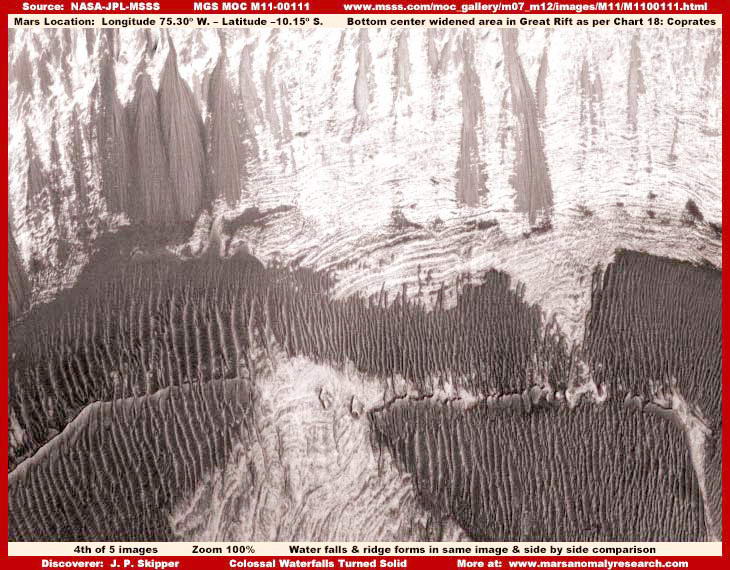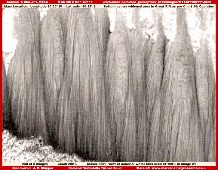 Ehhez jön még a képződmények túlságosan kis mérete, és ezért ellentmondásos értelmezhetősége, túl sok helyet sem akarunk elvenni további fotók felsorakoztatásával, a 4-es és 5-ös fotók mellett. Igen alapos vizsgálat kellene, a rendelkezésünkre álló szegényes felbontás mellett. Ezek a gerincformák a maximálisan elérhető nagyítás mellett, úgy tűnik, ami a tetejüket illeti, mintha számos, különböző magasságú szögletes objektummá bomlanának fel, sorokba rendeződve. Ezek a szögletes elemek nem követik a pixelezettség hálózatát, a gerincformák között pedig kisebb magasságú, de ugyancsak szögletes formákat találhatunk. Ismételjük, a fentiek nem vehetők bizonyosságnak, hiszen az alakzatok túlságosan kicsinyek és a felbontás miatt leírásuk tele van ellentmondásokkal. Hamarosan mindenki számára megérthetővé válik, hogy az M11-00111 jelű fotócsíkon látható alakzatok, ha ritkán fordulnak is elő a Marson, mégsem tekinthetők szokatlannak, egyedülállónak, erre bizonyíték a fenti, ezúttal egy másik, a MOC E15-00946 jelű fotócsíkból vett részlet, amelyen egy egészen másik helyszínt örökített meg a kamera, de ugyancsak a szálas szerkezetű vízeséses formákat láthatjuk. Vegyük észre, ez a térség még az előbbinél is sokkal messzebbről látszik, s 200%-os nagyítást kellett már eleve alkalmazni, hogy elemezhessük. Az éles határvonal a világos és sötétebb területek között első látásra úgy tűnik, mintha a vízeséses formákat balról-jobbra körülölelő dombhát által vetett árnyék lenne. Emiatt a vízeséses képződmények alsó része rejtve marad előlünk e sötét területen. Az egyetlen vonás, ami ezen a képen jobban látható a korábbiakhoz képest a jóval nagyobb távolság ellenére, nem más, mint a vízeróziós csatornák, belemaródva a felszínbe, ahonnan végül a vízeséses alakzatok is kiindulnak. Valójában, a legjobban bemaródó eróziós csatornák eredményei a legnagyobb vízeséses formák, ez a jellemvonás pedig rendkívüli fontossággal bír, azért is választottuk ezt a fotócsíkot, hogy a valós helyzet bemutatása egyértelmű legyen. Ismét megismételjük a már ismertetett álláspontot, miszerint a világos színű, magas albedójú felső rész, a belé mélyen belevágódott eróziós csatornákkal nem más, mint igen ősi, nagy mennyiségű üledékes anyaggal szennyezett jégtakaró, s nem pedig sziklás anyag, vagy közönséges talaj csupán. Azonban nem mehetünk el alapos megtekintés nélkül a felvétel bal oldalát betöltő, sötét színű gerincformák mellett sem. A gerincformák felbukkanása ismételten csak megerősíti a sekély jelenlétét, azt, hogy széles területeken folyik át, akár látjuk közvetlenül, akár nem. Figyeljük meg, miként terjednek ki egészen a dombhátig, ennek a jelenségnek is lehet köze az árnyékhatás kialakulásához a vízeséses formák alapjainál. A gerincformák kiterjedése, egészen eddig a pontig, arra utal, hogy időnként átcsaphat a víz a dombháton, vízeséses formák alapjainál található mélyebb részeken keresztül, és aláfolydogálhat azokon a területeken, melyeket a gerincformák elfoglaltak. Ez arra utal, hogy ez a bizonyos dombhát nem lehet kellően magas ilyen mértékű árnyék vetésére a vízeséses formák alsó részére, sokkal valószínűbb sötét színű folyékony víz jelenléte a vízeséses formák alapjainál a vízgyűjtő rendszer árkában. Ha csak természetes geológiai hatások munkálkodnának itt, akkor a vízeséses formák mérete, a tekintélyes szélességük, annak mértéke, amennyire a kiindulási pontjuktól nézve szétterjednek, a gerincformák jelentős száma, mind-mind olyan tényező, ami arra utal, hogy ezek a képződmények nagyon hosszú idő alatt jöttek létre. Egyértelműen jelzi, ez a két különböző, víz létrejöttét igénylő forma ősi, történeti korokkal ezelőtt jött létre, és igen stabil. Következésképpen, a folyamatos vízellátás biztosított, erre alapozva pedig tartós életközösség jöhetett létre. Miként az korábban kijelentettük, a gerincformák minden esetben valamiféle életre utalnak, ebben Skipper teljesen biztos, s kétségtelenül kihasználják a folyékony víz jelenlétét, mint forrást. Ám létezhet kevésbé látványos képződményeket létrehozó életforma is a helyszínen, ebből a távolságból kicsúszik érzékelési képességünk alól. Skipper álláspontja szerint, maguk a vízeséses formák is valamiféle kisebb méretű szervezet tevékenysége nyomán jöttek létre. A kérdés az, miféle élet? Ez az a pont, ahol a rendelkezésünkre álló ismeretek már nem elégségesek: a felbontás siralmas, a helyszín nagyon távoli, a feltételezett élőlények mérete túl apró, határozott kijelentés tehát nem tehető. Más szavakkal, nem tudjuk bizonyossággal megválaszolni a feltett kérdést, csak a már eddig megtett kijelentések révén. Például, ha ebből a nagy távolságból figyeljük meg, a tudományos adatok által kínált szegényes felbontáson, a gerincformák gerincformáknak tűnnek. Skipper határozott meggyőződése, hogy minden egyes esetben sekély vízben jönnek létre, lejtős területen. Minden egyes felvételen igen rossz felbontásban láthatók, ám a közös vonások beazonosíthatók. Ahogy egyre idősebb képződményekkel találkozunk, úgy lesznek magasabbak és szélesebbek, s nyilván sikeresebbek is, ám mindig párhuzamosan futnak a víz lefolyásának irányával, azt sohasem gátolják. Igazából, Skippernek meggyőződése, hogy az árkok a gerincformák között szándékos tervezés eredményei és a lejtőn aláfolyó víz hatásának minél hatékonyabb felhasználását célozzák. Első benyomása ezekről a képződményekről már vízalapú életformákra vonatkozott, esetleges