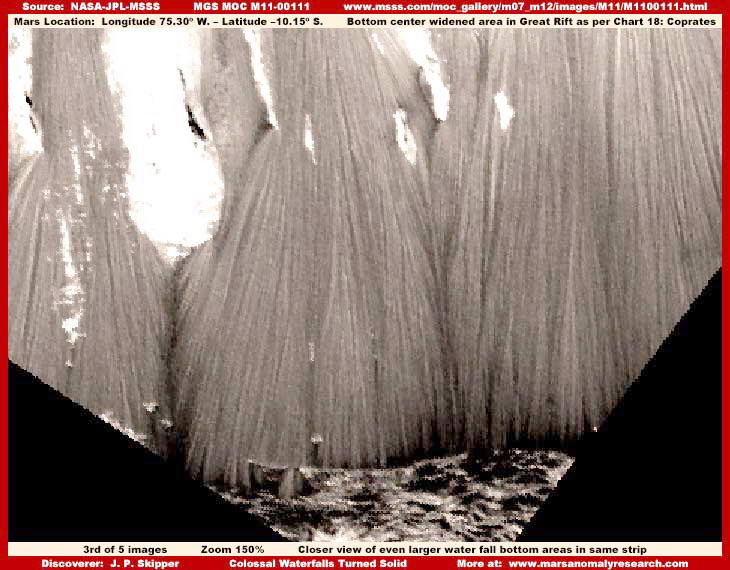Miként az jól látható beszámolónk első, az MGS MOC M11-00111 katalógusszámú fotócsíkján, kétségtelenül az egyik legütősebb képződmények találhatók, melyeket a marsi fotókon nyilvánosságra hoztak számunkra. Furcsák, szépséges megjelenésűek, de ott a kérdés: mik ezek? Az ok, amiért ezeket a fotók kissé kimosottaknak tűnnek az, hogy a megfigyelhető képződmények az alapjaiknál már-már kivehetetlenül sötétek voltak, ezért az egész felvételen jelentős világosítást kellett alkalmazni. Mindeközben arra törekedve, hogy a legtöbb részlet továbbra is kivehető maradjon, e szálas alakzatok tetejétől az aljáig elemezhetők legyenek. Fontos tudni, az 1., a 2. és a 4. Felvételt 90 fokkal elforgattuk az eredeti fotócsíkhoz képest a kedvezőbb látvány és a megszokott függőleges tájolás végett. „Vízeséseknek” soroltuk be ezeket a képződményeket, s nemcsak azért, mert külső megjelenésük olyan, hanem azért is, mert bizonyos mértékben tényleg azok. Még az elején fontos leszögezni, Skipper bizonyos értelmezéseiben teljesen biztos, míg más vonatkozásokban már korántsem, ám remélhetőleg később ez utóbbiak is magyarázatot nyernek. Azzal is tisztában kell lenni, hogy a bemutatott helyszín igen távoli, a felbontás emiatt, s a világos színek következtében különösen rossz, ezért nem várhatjuk el, hogy túl sok mindent pontosan be tudjunk azonosítani, a kifejezetten nagyméretű dolgok kivételével a vízesés-jellegű képződmények közvetlen környékén. Az ember hajlamos ezeket a szokatlan, ám annál hatalmasabb formákat kisebbnek becsülni valós méretüknél, abszolút értelemben. Mindig tartsuk szem előtt, hogy ez csupán érzékcsalódás, ne felejtkezzünk meg róla, ezek az objektumok valójában hatalmasak, emberi léptékkel mérve, kolosszális nagyságúak. Egy normális méretű épületet alapul véve, még csak kicsiny pöttyként sem érzékelnénk e vonalas külsejű képződmények alján. Éppen emiatt képesek mégis átütni a gyenge felbontás jelentette korlátokon; a beidézett fotócsíkon még néhány jellemző részletüket is megvizsgálhatjuk, azaz tényleg hatalmas méretűek. Jelen esetben lényegében semmiféle összehasonlítási alapunk sincs, a környező táj viszont annál könnyebben hamisítható, és bizonyára éltek is e lehetőséggel. Fontos háttérismeret, miszerint a felvétel felső része komoly magasságot képvisel a környező vidékekhez képest, a fotó közepén megjelenő különleges formák viszont meglehetősen meredeken hullnak alá. Ennek fényében figyeljük meg a számos párhuzamos repedést a sziklákban a felső részen, függőleges, lefelé irányítottságukat, a vonalas szerkezetű képződmények lényegében ezekhez csatlakoznak. A felső részen e „repedések” lényegében nagyobbak, mint jó néhány tekintélyes hasadékvölgy, a csökkentett méret és a rossz felbontás láttatja őket kisebbnek. Teljesen mindegy, miként hivatkozunk rájuk, repedéseknek, völgyeknek, hasadékoknak, akárminek is nevezzük őket, egy biztos, folyékony, a gravitációs erők következtében, nagy magasságból alázúduló felszíni víz alakította ki őket. Ez a legfontosabb tényező. Részletesen be is mutatjuk a folyamatot, s nemcsak a különleges megjelenés elemezzük. A nagy magasságok ellenére, arra gyanakszunk, a világos színű, nagy fényvisszaverő képességgel rendelkező rész a kép felső részén, a sok-sok vízeróziós nyommal, minden bizonnyal egy igen ősi jégpáncél maradványa lehet, mely ellenállt az időszakos olvadási időszakoknak, geológiai korszakokon át, mivel üledékes anyaggal igencsak bőven rendelkezik, s mára már legalább annyi sziklatömböt is tartalmat, mint amennyi vízjeget. Ezekben a magasságokban, a fokozott lehűlés miatt, a légköri pára ismételt kiválása, hó formájában, ugyancsak gyakori lehet, tovább vastagítva a jégtömeget, újabb és újabb rétegeket húzva rá. Ezek a felső rétegek természetesen sokkal érzékenyebben reagálnak a felmelegedésekre, azaz könnyebben megolvadnak, mint az üledékes anyagot bőségesebben tartalmazó alsóbb rétegek, alattuk. Ahogy az időszakos felmelegedések és/vagy a Nap sugárzási erejének változása számos, sekély vizű lefolyást eredményez a völgyek lejtőin, majd ezek a lefolyások egyesülnek a mélyebb völgyekben, azután szabályosan átvágják magukat a keményebb alapkőzeteken is, lefelé haladtukban, az alsóbb szintek felé. Ahogy a folyamat kifejlődik, a víz, megpakolva az üledékekből álló terhével, elér egy meredeken alázuhanó ponthoz, ahol a folyás esése hirtelen megnő, lezúdul a lejjebb fekvő területekre, az áramlási sebessége ugrásszerűen megnő, de nem olyan mértékben, nem annyira, hogy szabadon szétszóródjanak a szállított részecskék a levegőben, miként egy teljesen függőleges zuhatagban tennék. Jelen esetben a víz lágyabban hullik alá a sziklafelszín tetejéről, s később végigfolyik azon a szilárd felületen, melyet önmaga hozott létre. Ahogy a víz eléri a jelentősen meredekebb lejtőket, és erősebben kezd folyni, minthogy az üledékes anyagot és a hordalékot magával tudja szállítani, azok hátra maradnak, és leülepednek a vízfolyás aljára, megtelepszenek a szilárd felszínen, miközben a víz tovaáramlik felettük. Amikor ezek a feltételek hosszú időn át fennállnak, a víz folyásának útvonala jelentősen megvastagszik az üledék lerakódása révén, a kivált anyag pedig a megfigyelhető szálas szerkezetű formákat hozza létre. A fentiek megértéséhez feltétlen szem előtt kell tartani a Mars kisebb gravitációját. A folyamat igen hasonlatos a barlangrendszerekben a csöpögő víz nyomán keletkező sztalaktitokhoz, ott is az ásványi összetevők válnak ki a vízből, s alakítanak 