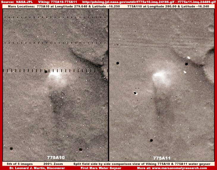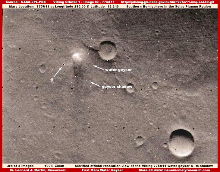 Ebben a beszámolóban egy régebben felfedezett víz-előfordulási helyszínt mutatunk be, a bő harminc éves Viking mesterséges hold képi adatgyűjteményéből, feltételezhetően az elsőnek számít bármiféle folyékony vízzel kapcsolatos felismerésnek a Marson. Mielőtt mások is foglalkoztak volna ezzel a felvétellel, bizonnyal az SPSR (Planetáris Közösség SETI Kutatások Céljából) néven ismert csoport tagjai, azon belül is mindenekelőtt Dr. Stanley McDanielt és Dr Vince Dipietrot illeti az elsőbbség. Az Interneten is elérhető beszámolójuk meglehetősen részletes, ám korlátozott minőségű képi háttérre épül, azóta pedig, és ez igen fontos momentum, e téren sokat fejlődött a világ és mélyebb ismeretekkel tudjuk kiegészíteni a témát. Remélhetőleg ez által lényeges újdonságokkal tudunk szolgálni a folyékony felszíni víz első felfedezésével kapcsolatban a Marson, és egyben rámutathatunk, e felfedezést nem szabad figyelmen kívül hagyni, és igenis az őt megillető helyre kell tenni. 1978. augusztusában a Viking 1 keringő egységének kamera-rendszere két egymást követő felvételt készített a Mars Solas Planum térségéről. Az elsőt, az ID#775A10 jelűt a „B” jelzésű kamera készítette, 12:27Z időpontban, míg a másodikat, az ID#775A11 jelűt az „A” jelzésű kamera néhány másodperccel később, 12:32Z időpontban – a hivatalos Viking statisztikai adatok szerint. A Viking keringő egység által visszaküldött felvételek eljutottak többek között Dr. Leonard J. Martinhoz is, a Flagstaffban, Arizona államban található Lowell obszervatórium, elismert és a fő tudományos áramlat nagy szaktekintéllyel rendelkező bolygókutató tudósához is. 1980. Decemberében a NASA tevékenységekről szóló hírlevél (Vol. 11. No. 12.) tudatja az olvasókkal, hogy Dr. Martin beszámol legújabb felfedezéséről, mely szerint árnyékot vető kisebb felhő látható talajszinten, az említett két felvételen. Dr. Macdaniels beszámolójában (eredetileg itt volt található, de azóta már eltüntették: http://www.stanmcdaniel.com/mars/brfpref.htm) a NASA tevékenységéről az alábbiak olvashatók: „Martin véleménye szerint, a szokatlan alakú felhő, s a rajta megfigyelhető gyors változás mindösszesen 4.5 másodperc alatt, a két felvétel elkészülte közötti időtartam során, arra utal, hogy valamiféle robbanásos jelenségnek vagyunk tanúi, mint például egy gejzír, gőzkitörés.” Dr. Martin értelmezése szerint a felhő, melynek árnyéka egyértelműen függőleges helyzetű, ehhez halvány kétség sem férhet, akár háromnegyed kilométer magas is lehet, következményeként igen komoly és agresszív kihívást intézett a Viking kutatócsoportja ellen Dr. Convay Snyder vezetésével. Habár Snyder igyekszik racionálisan megközelíteni a problémát, úgy tűnik, inkább érzelmi alapon vitázik, s nem a tények alapján, érvei hihetetlenül gyengék, a felfedezést igyekeztek gyorsan eltüntetni a színről, meglehetősen hatékonyan, misztikusnak feltüntetve az egész jelenséget kivonni figyelő szemek elöl. Van annak bármi értelme, hogy akár a NASA, akár a JPL, s vele az egész világ, egész egyszerűen tudomást sem hajlandó venni egy ilyen rendkívüli felfedezésről, melynek értelmében első alkalommal, és nagy valószínűséggel, sikerült folyékony víz nyomaira bukkanni a Marson? Semmiféle kérdéseket nem tettek felé a Viking-felvételek alapján, nem indult semmiféle alaposabb vizsgálat, semmi valódi elemzés, se újabb felvételek nem készültek az adott területről, de még a MOC jelentősen magasabb színvonalat képviselő kameráját sem irányították a környékre. Egészen felfoghatatlan, hogy mindez megtörténhet. Pláne annak fényében, hogy valamennyi hivatalosan bejelentett marsszonda megtette a maga felszíni folyékony víz jelenlétére vonatkozó felfedezését, a NASA és a JPL pedig már 30 éve játssza az ostobát, s úgy tesz, mintha semmi sem történt volna, vagy néha előállnak a „szenzációs bejelentéssel”, hogy aztán két nap múlva visszavonják. Kétségtelenül, az SPRS-tag Dr. Vince DiPietro és Dr. McDaniel megpróbálta a NASA figyelmét erre a jelenségre terelni, ám nyilvánvalóan kőfalakba ütköztek. DiPietro megkísérelt néhány médiumot is bevonni, kezdeményezni az érdeklődés felkeltését a felfedezéssel kapcsolatban, ám természetesen nem sikerült bekerülnie a címszavak közé sem. Igen rövid beszámolót találhatnak a némában a következő címen: http://www.lauralee.com/jpl.htm, s egy kicsivel hosszabb írást a Florida Today, azonban ezt a cikket is időközben, sajnálatos módon, leszedték az Internetről, a következő címről: http://www.floridatoday.com/news/columnists/cox/080900cox.htm Az 1980-as években tett felfedezést követően Dr. Martin láthatóan visszavonult saját köreibe, eltűnt a mindennapos munkájában, és nagyon keveset beszélt – még a kollégáit is beleértve a Lowell Obszervatóriumban – a következő évtizedekben erről a jelentős felismerésről, mintha elbizonytalanodott volna a Viking adataiban talált korszakalkotó felfedezést követően, vagy csak egyszerűen kevésbé harcos alkat volt, nem akarta felvállalni a nyilvánosság előtt az összeütközést, estleges hivatásos ellenzőkkel, netán „együttműködő” a hatalommal, netán a NASA és/vagy a JPL figyelmeztette, kockáztatja tudományos karrierjét, ha fenntartja az álláspontját? Ki tudja? Skipper úgy találta, hogy Dr. Martin zavartalanul végezte tovább a munkáját a Lowell Obszervatóriumban, továbbra is részt vett a marsfotók feldolgozásában, később pedig a Hubble űrteleszkóp fotóinak elemzésében is, egészen 1997. Április 7-én bekövetkezett haláláig. Munkásságáról, a marsi tudományos adatokban betöltött szer
