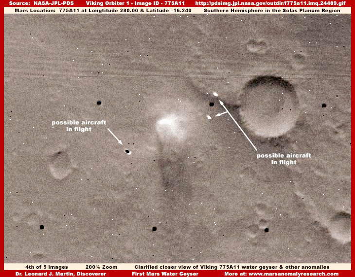 A fenti, negyedik felvétel, közelebbi rálátást enged a #775A11 jelű képre és a gejzírre. Ne felejtsük el, csak mintegy 4.5 másodperc telt el a két felvétel készítése között, mégis jól látható a vízkitörés felhőjében bekövetkezett változás, s vele együtt a kitörés által vetett árnyékban is. A különös objektum a kitöréstől balra lefelé most még érzékelhetőbben látszik, közelebbi vizsgálat azonban továbbra sem lehetséges, hiszen a fehér pixelek száma megnövekszik, a sötét, központi területről sem tárul fel újabb részlet. Skipper véleménye szerint, ellentétben más alakzatok körül megjelenő fehér pixelezettséggel, a szóban forgó esetben mindez nem tekinthető a kamera természetes hibájának. Ellenkezőleg. A fehér pixelek csoportjához a feketéket szándékosan illesztették a forma felbontására, hasonló formától van szó, mint a vízkitöréstől jobbról felfelé nézve, nyíllal jelezve és felirattal ellátva a negyedik felvételen, két további, hasonló alak tekintetében, bár azok kisebbek, de nagy valószínűséggel a talaj felett, a levegőben tartózkodnak, kikerülik a gejzírt, s eléggé nagy sebességgel haladnak, a bal felső sarok felöl a jobb alsó felé irányultan. A repülési irány könnyen meghatározható a pixelcsoport elnyúltságából, a haladási irányba eső végükön elkeskenyednek, a végük felé pedig kissé elhalványodnak és kiszélesednek. Mindhárom esetben. Skipper álláspontja szerint repülőgépekről van szó, a talaj felett repülnek, de ahhoz aprók, hogy a maguk fizikai valóságában megjelenjenek ezen az igen szegényes felbontású képen, viszont elegendően fényesek ahhoz, hogy a kamera mégis rögzítse őket, jó néhány képponton is, amint keresztezik átlósan az alap-, merev pixelhálót. Talán, valaki beleütközött, felismerte őket mint gyorsan mozgó repülőgépeket, melyek természetesen nem léteznek a Marson, aztán, attól tartva, hogy más is felismeri, gyorsan belepiszkált kézzel a gejzírtől balra esőbe,, némi fekete pixelezettséget felhordva a legnagyobbra, felbontva annak formáját, ezzel a további kettő beazonosítását is nyilvánvalóan lerontva. Három együtt már túl sok lett volna. Így már könnyebben el lehetett adni ezen objektumokat, mint a kamera rendellenességeit, s kétségtelenül ez volt a nyilvánvaló taktikai elképzelés. Egész hatékonyan sikeredett. Ezen új ismeretek birtokában most már talán jobban megérthetjük a NASA és a JPL taktikáját az 1970-es és 1980-as években, azt, hogy mire nem akarják a figyelmünket felhívni, s azt is láthatjuk, milyen rendkívüli elszántsággal hamisítják már a régi Viking felvételeket is, valamint lesznek vakká és süketté a hozzájuk kapcsolódó felfedezések kapcsán. Az egyik legfontosabb ok, ami a felszíni víz jelenléte kapcsán elmélkedésekhez vezetne az ugye a hivatalos álláspont lelepleződése, innentől kezdve ugye nem lehetne agyonismételgetni a hazugságokat a Mars csontszáraz, rendkívül poros, az általunk mindenfajta életre halálos veszélyt jelentő körülményeiről. Másik ok, nyilvánvalóan még a képen megfigyelhetőnél is sokkal több víz volt jelen eredetileg a felvételeken. A hallgatás és a hihetetlen mértékű tudatlanság, nemtörődömség, miszerint ilyen jelentőségű felfedezésről egyszerűen tudomást sem akarnak venni, a kőfalak felhúzása, mindenféle értelmes ok nélkül, teljességgel megmagyarázhatatlan, még abban az esetben is, ha hozzávesszük a hidegháború miatt kialakult paranoiát az 1970-es évek végén és az 1980-as évek elején. Ez utóbbi fényében viszont éppenséggel megérthetjük, mitől vált Dr. Martin önkéntesen együttműködővé, s hagyta elhalni a hírt a folyékony felszíni víz marsi felfedezéséről. Nos, a repülő eszközök és az intelligens élet bizonyítékai mellett, nem hagyhatjuk a feledés homályába merülni ezeket a régi Viking felvételeket manapság sem, amikor sokkal hangsúlyosabb és egyértelműbb bizonyítékokat tárnak elénk a jelenleg működő marsszondák, a folyékony víz legelső felfedezése semmit sem vesztett fontosságából. Hogy miért? Mert habár Dr. Martin mára már el is tűnt, ő tette a legfontosabb felfedezést a Marson felszíni folyékony létezésére, emiatt sokkal tisztességesebb elbánást érdemes, s a történelmi megítélése kapcsán is.