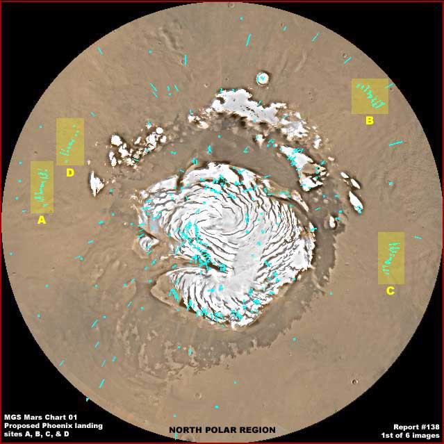 Jelen beszámolóban szó esik a szinte teljes bizonyossággal kiterjedt biológiai életről a Mars Északi Sarkvidékén, valamint a Phoenix űrszonda tervezett leszállási helyeiről – e vonatkozásban. A fenti, első felvételen az MGS MOC marstérképének 01-es számú eleme, az Északi Sarkvidéket ábrázolja, a lehetséges leszállóhelyek A, B, C, és D betűvel jelölve. A zöldeskék kicsiny vonalak az R22-től az S02 jelű, ezekről a térségekről készült fotócsíkok sorozatának helyét mutatják. Figyeljük meg, milyen mértékben sűrűsödnek a célterületeken. Valószínűleg a B-vel jelzett helyszín kiválasztására kerül majd sor.