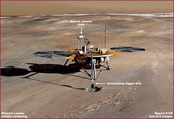 Most pedig szenteljünk figyelmet a fenti, második felvételnek, a Phoenix leszálló-egységét ábrázolja. Az űrszonda várhatóan 2008. Május 25-én éri el a Mars felszínét, ha semmi probléma nem jön közbe. A felszínt irányított leszállással közelíti meg a légkörön keresztül, ezáltal nagyobb pontosság érhető el, összehasonlítva azokkal a durva leszállásokkal, melyeket például a marsjárók hajtottak végre. Ha esetleg valaki nem tudná, a Phoenix „leszállóegység”, a meghatározása szerint, azaz nem képes elmozdulni a leszállás helyéről, miként a Spirit vagy az Opportunity marsjárók teszik. Ha minden rendben megy, megkaparja a leszállás környékén a kiszemelt területet és egy hosszú, csuklós karral felássák a talajt körülötte. Azután teszteli és analizálja a kiásott talajt. A hivatalos állítások szerint meghatározott elsődleges cél a vízjég jelenlétének keresése a talajban, hiszen ha egyáltalán vízjég van a talajban, logikus, akkor azt meg kell tudni találni a fagyott Északi Sarkvidéken, mivel ott nagyon hosszú időn át fennmaradhatott. Jól hangzik, azonban had idézzük itt fel Skipper néhány egyéni gondolatát a hivatalos állásponttal összefüggésben. Lesznek olyanok, akik a kerítés különböző oldalain állva nem feltétlen értenek egyet a semminél is kevesebbet megcélzó kutatással, ugyanis tudjuk, az Északi Sarkvidék térsége igencsak száraz a Déli Sarkvidékkel való összevetésben. Más szavakkal, vízjég igencsak ritkán fordul elő az Északi Sarkvidéken, viszont bőségesen található a Déli Sarkvidéken. Az elmondottak annak tudhatók be, hogy az Északi Sarkvidéken valaha esetlegesen megtalálható víz az ősi időkben lefolyt délre a Valles Marineris árok/törésrendszeren, egyidőben a hatalmas kiterjedésű vulkanikus vidék felemelkedésével a hasadéktól északnyugatra, kiszorítva a vizet a leszállási hely térségétől délre és északra. Csak azt tudjuk elmondani, akár elfogadják, akár nem, hogy azok a hivatalnokok, akik úgy döntöttek, hogy víz után ásnak olyan területen, ahol igen kevés fagyott állapotú vízjég található, nemigen tekinthetőek logikus gondolkozásra képesnek. Sokkal értelmesebb lenne egy ilyen szondát a Déli Sarkvidékre küldeni vízjég kimutatásának céljából. Másrészről, amennyiben biológiai élet burjánzik a Déli Sarki Területeken, miként azt Skipper kutatásai nyomán állítja, akkor ugye egy biztonságos leszállási helyet keresve arrafelé, igencsak megadná az értelmét egy ilyen küldetésnek, és semmi olyan ok nincs, ami miatt ne oda kellene menni. Miközben tehát a Déli Sarkvidék hemzseg az élettől, kihasználván a felszíni víz nyújtotta bázist, mindez nem mondható el az Északi Sarkvidékről a biológiai élet jelenléte kapcsán, egyszerűen azért, mert hidegebb és szárazabb. A fentiek ismeretében vegyük szemügyre a következő képet.